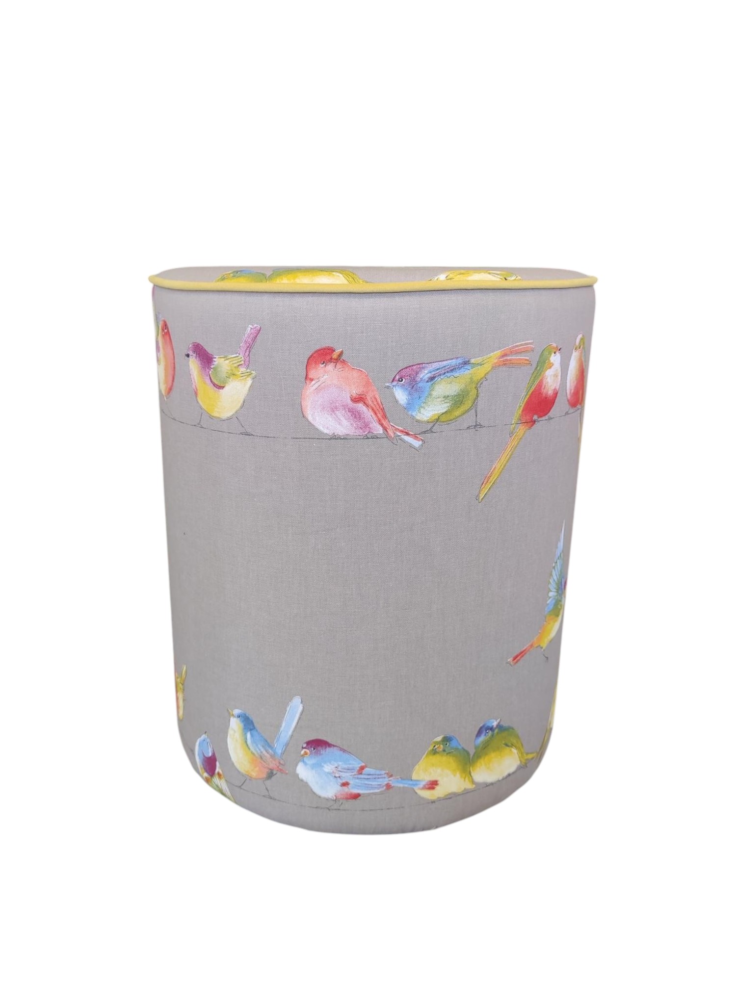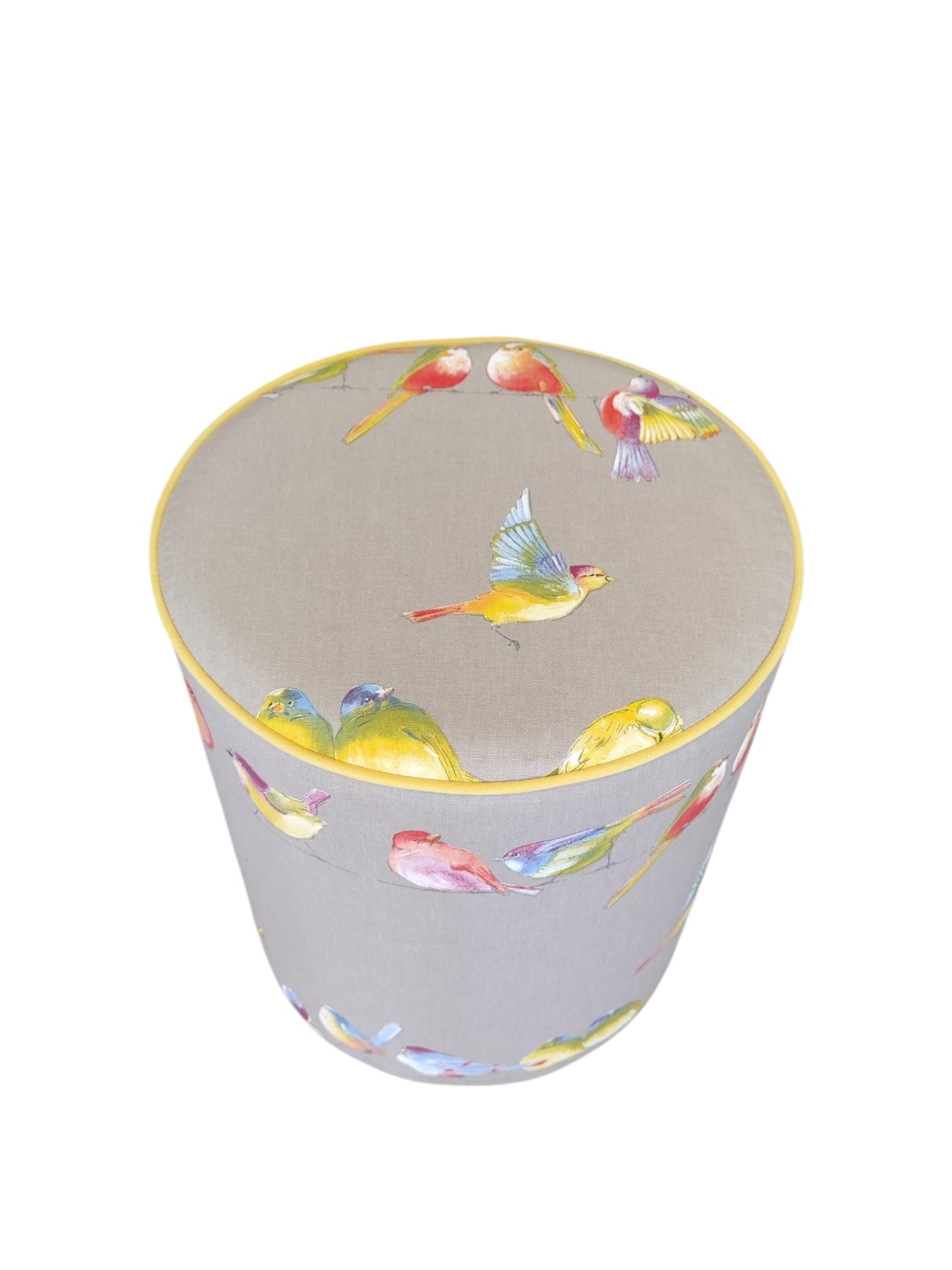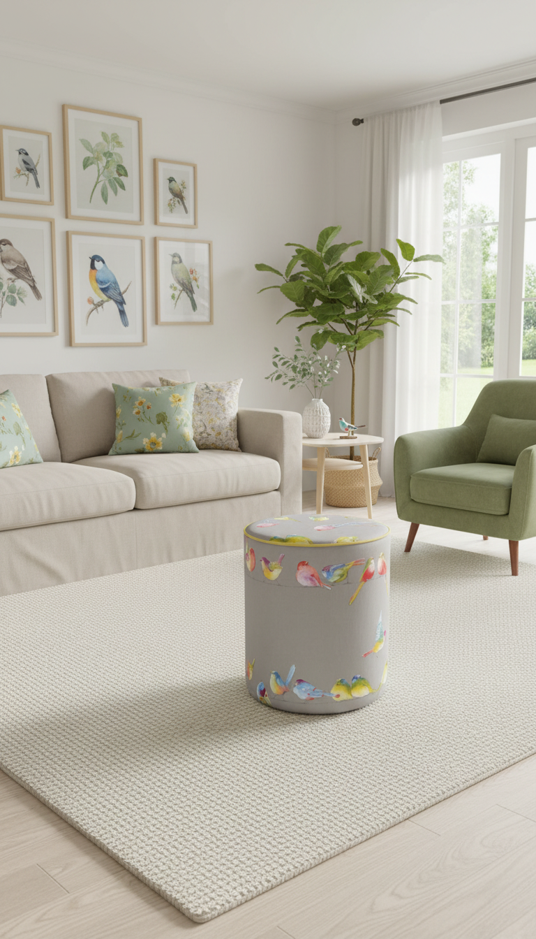 Pouf tapizado con estampado de pájaros y vivo decorativo