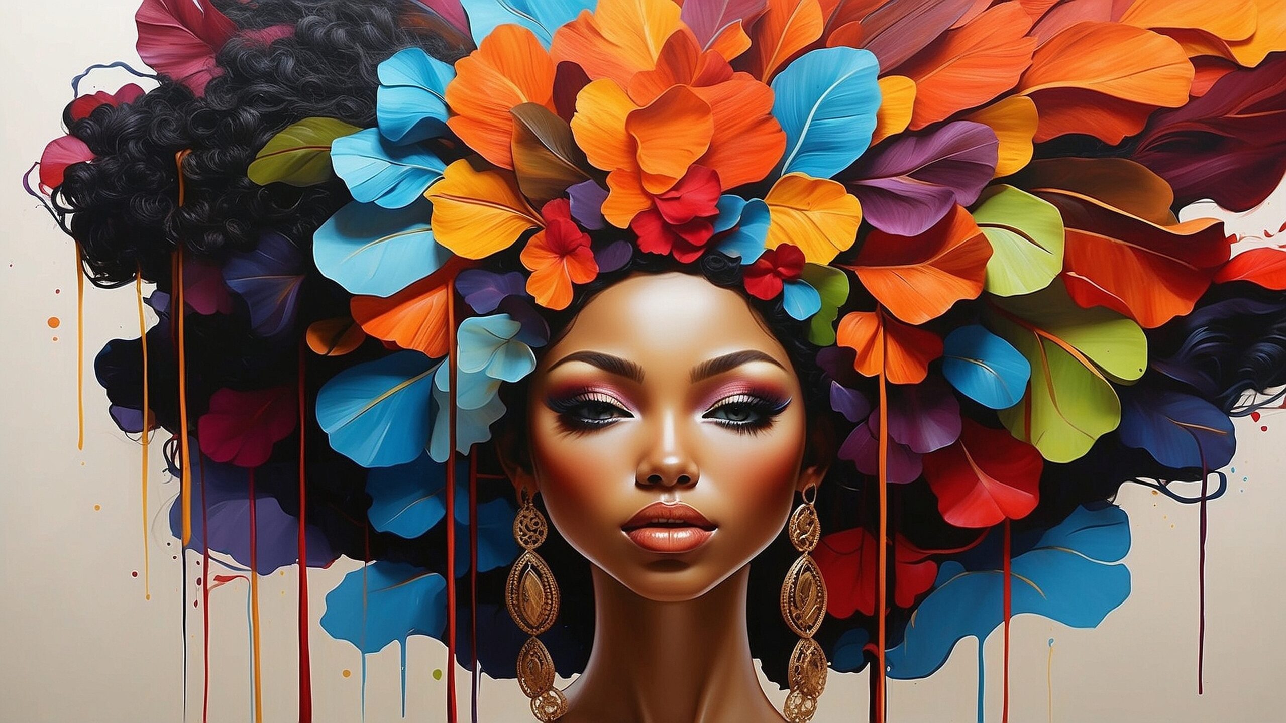 La imagen retrata a una mujer poderosa y serena, rodeada de un estallido de hojas y flores vibrantes que simbolizan la conexión con la naturaleza y la fuerza interior. Su mirada transmite confianza y equilibrio, mientras los tonos intensos aportan vida, movimiento y personalidad.