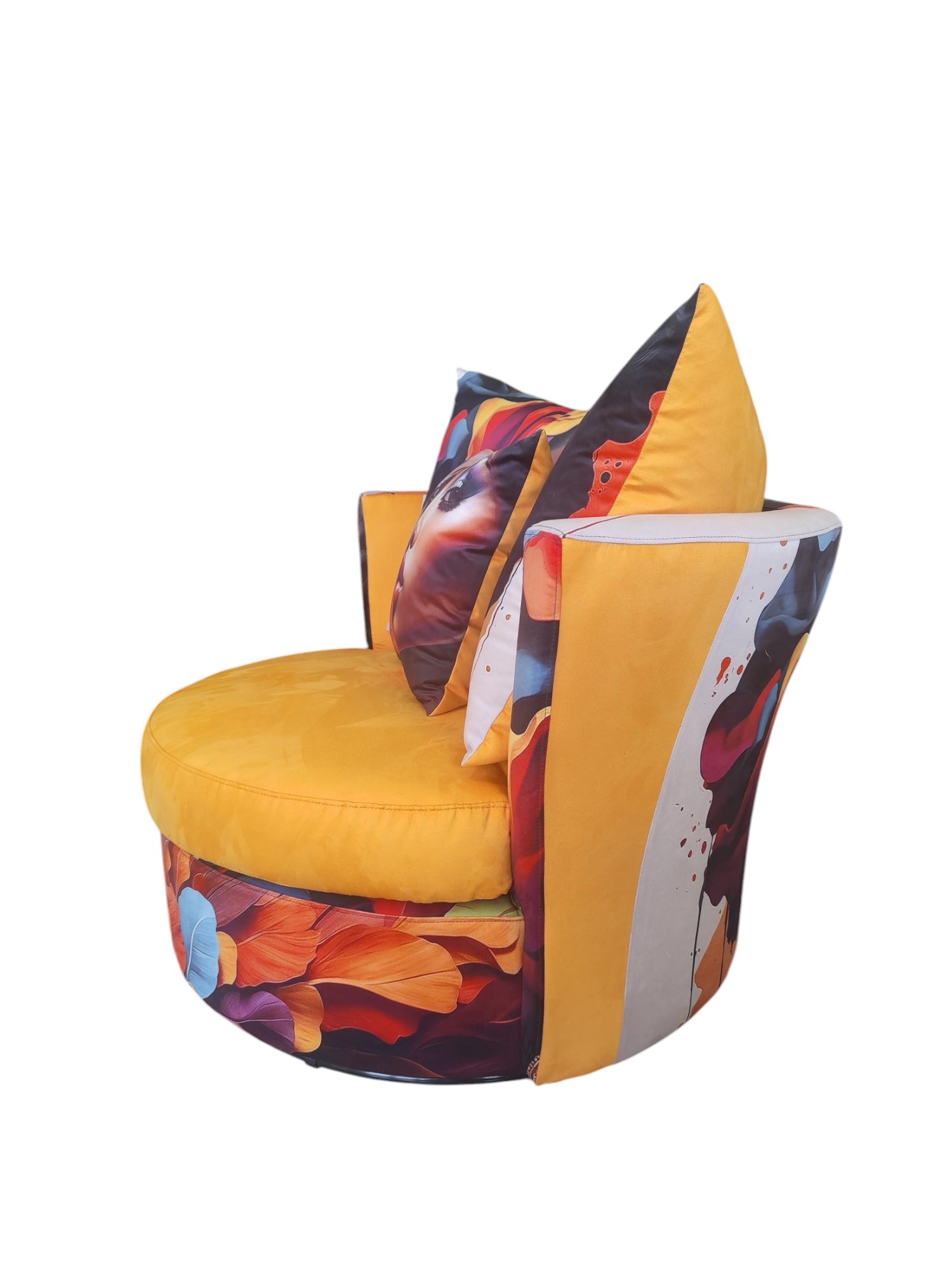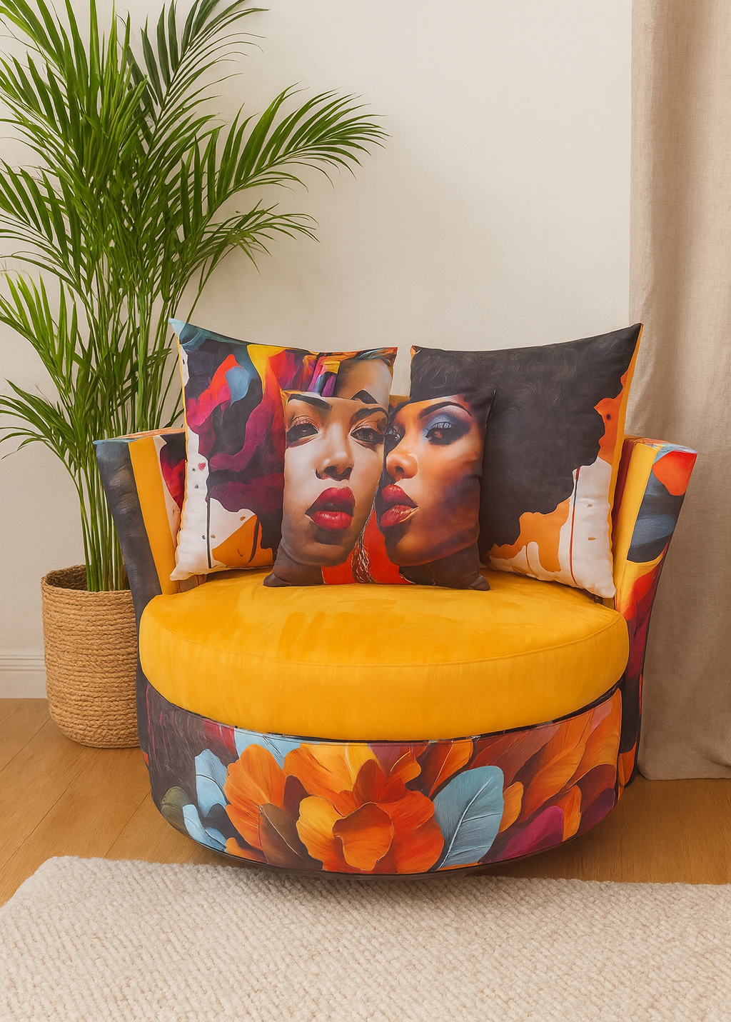 El Sillón “Afro Chic” es una pieza de diseño exclusiva que combina arte, color y elegancia contemporánea. Su tapizado con ilustraciones artísticas y flores tropicales crea una presencia imponente y sofisticada, perfecta para quienes buscan una decoración con identidad y estilo propio.