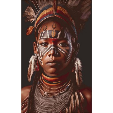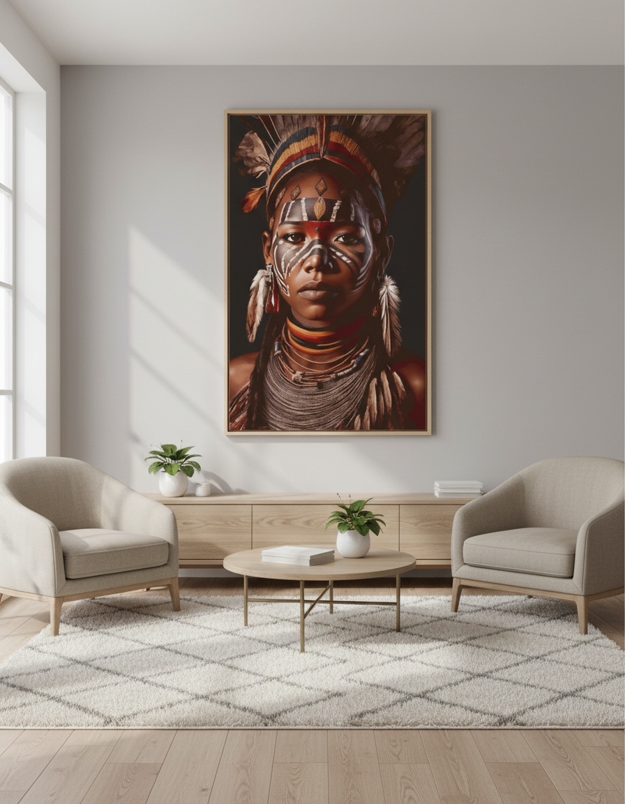 Este tapiz de pared tejido directamente en telar y tapizado sobre bastidor, representa la fusión perfecta entre arte y cultura. La figura central, poderosa y serena, evoca la esencia de los pueblos originarios africanos, con detalles que celebran la tradición, la valentía y la espiritualidad.