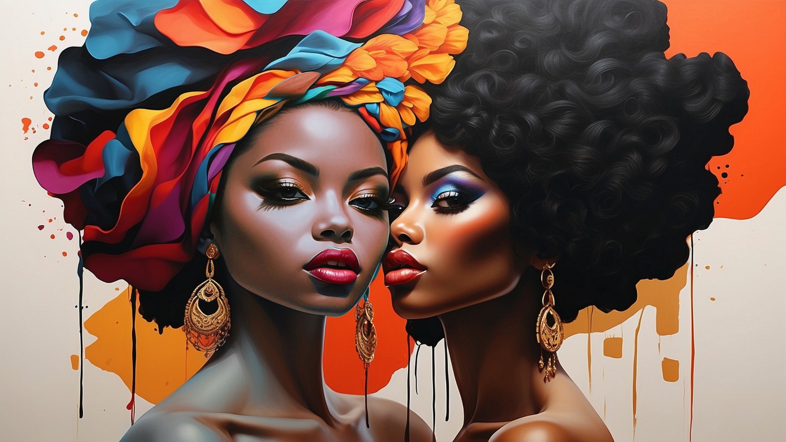 La imagen muestra dos figuras femeninas poderosas, con miradas profundas y seguras, envueltas en una explosión de tonos cálidos y contrastantes. Cada detalle —desde los pliegues del turbante hasta la intensidad de sus expresiones— transmite confianza, sororidad y elegancia.
