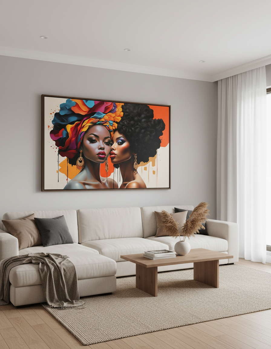 Este cuadro de diseño propio, impreso sobre tela y tapizado en bastidor, es una obra que celebra la belleza, la diversidad y la conexión entre mujeres. Una pieza vibrante que combina arte y emoción, perfecta para quienes buscan llenar sus espacios de energía, color y significado.