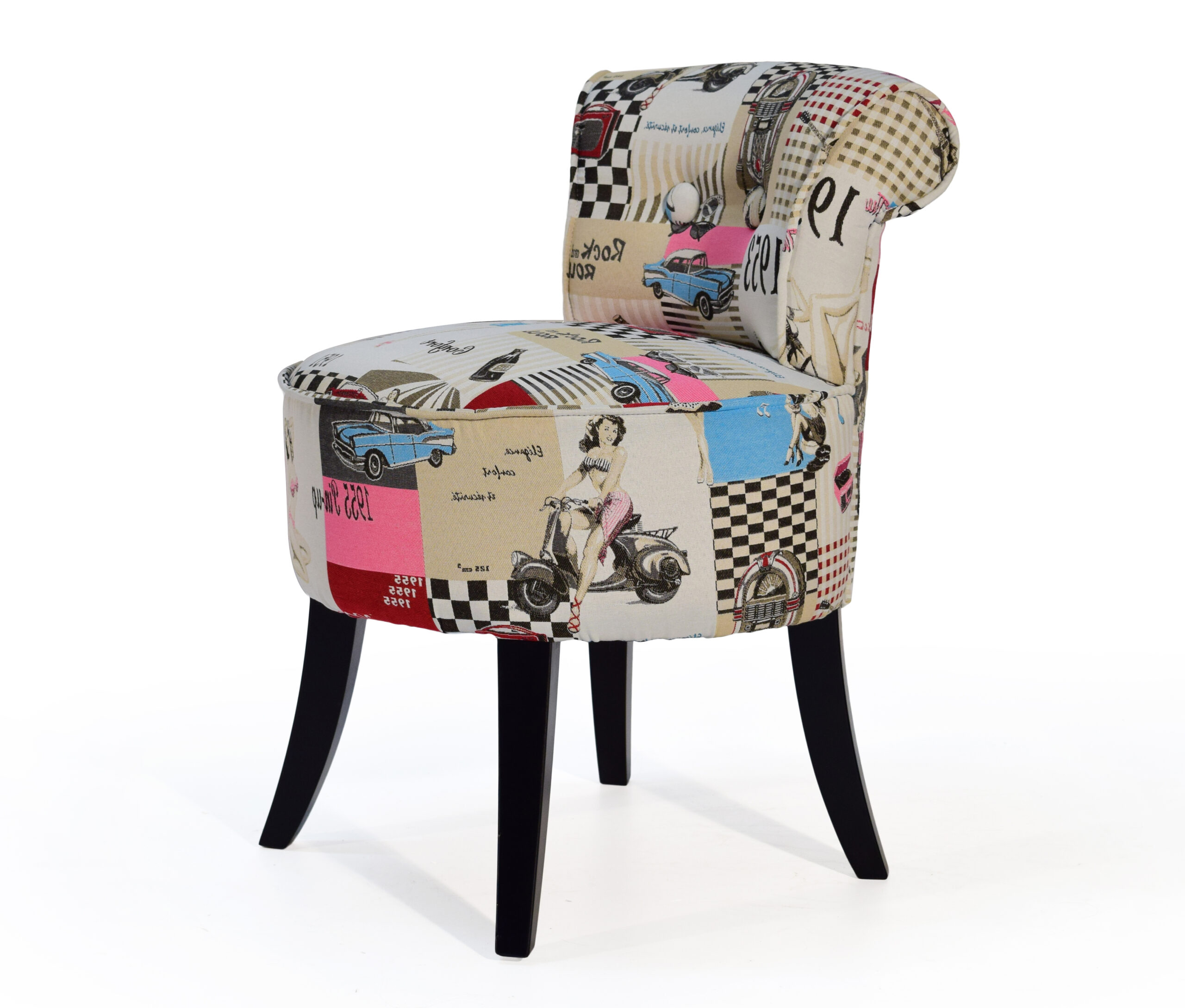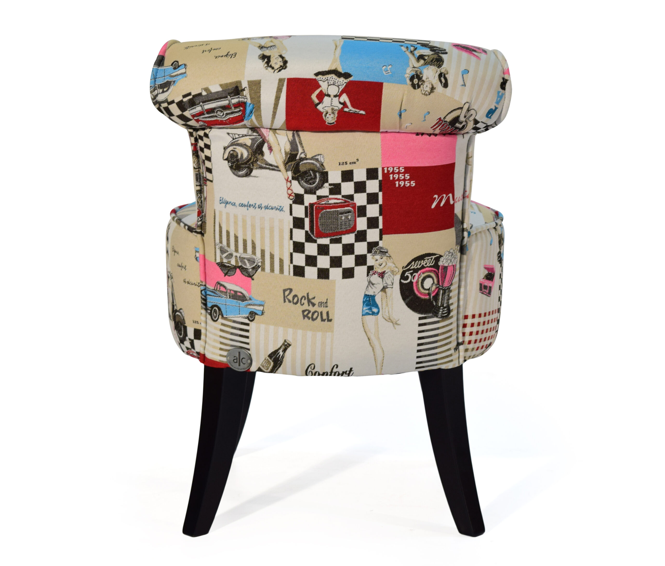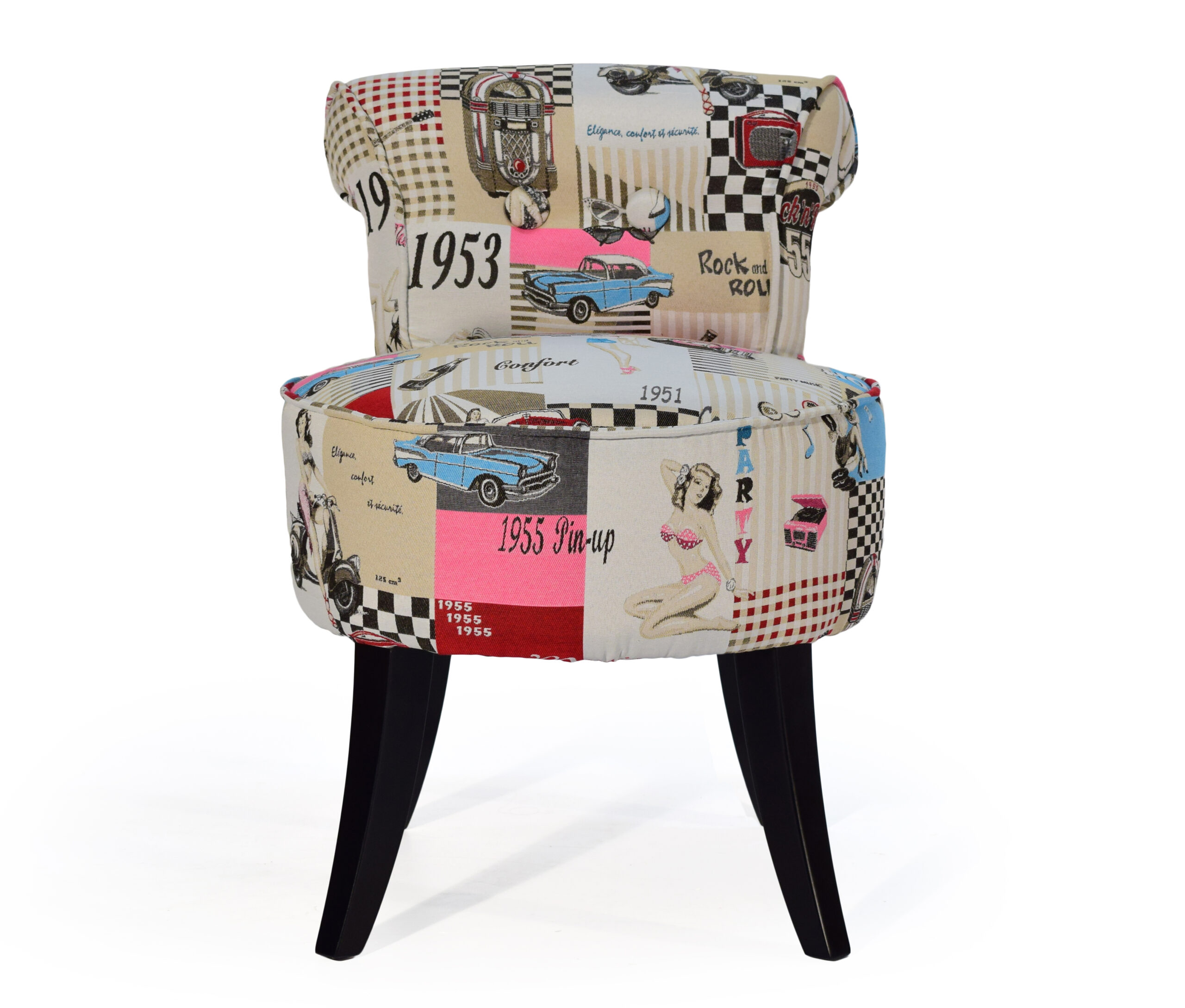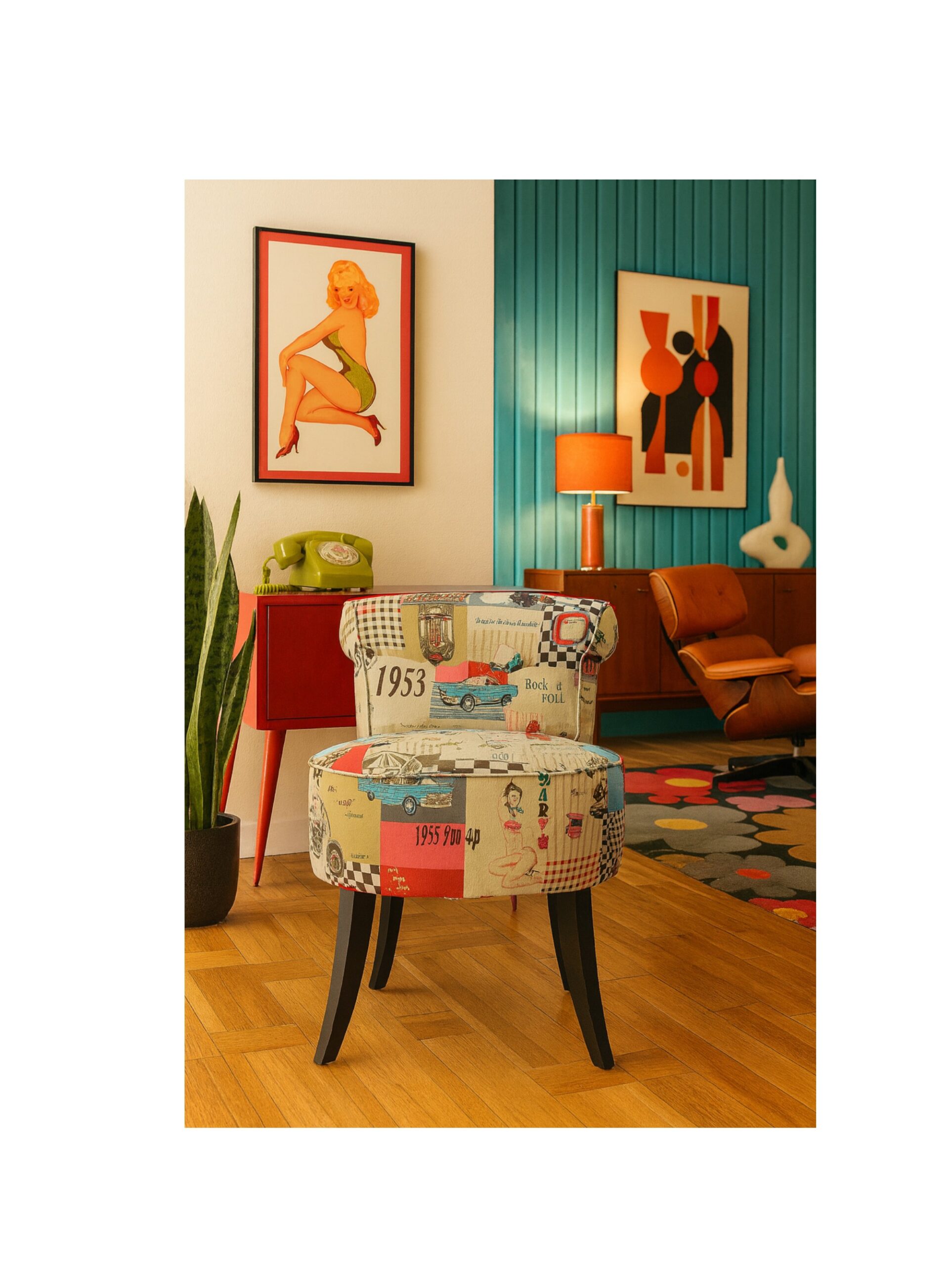 Aporta un aire vintage y lleno de personalidad a tu decoración, su tapizado con motivos de los años 50, coches clásicos, jukebox y figuras pin-up lo convierte en una pieza única y decorativa.