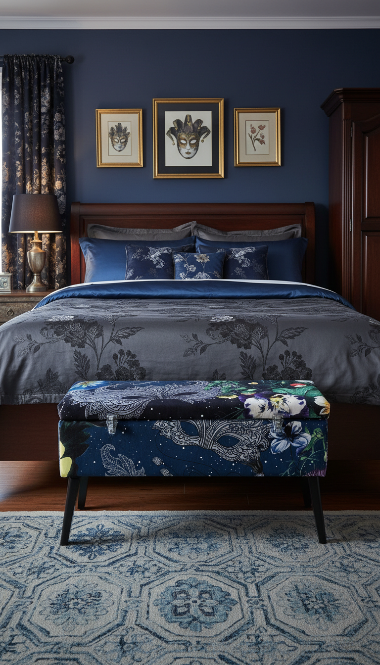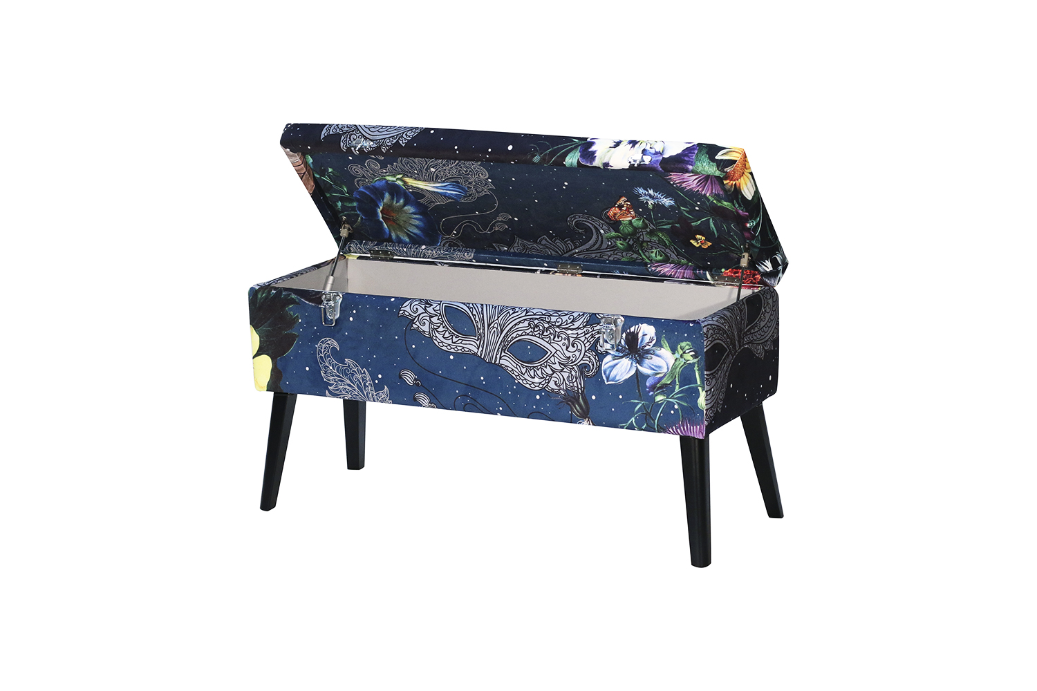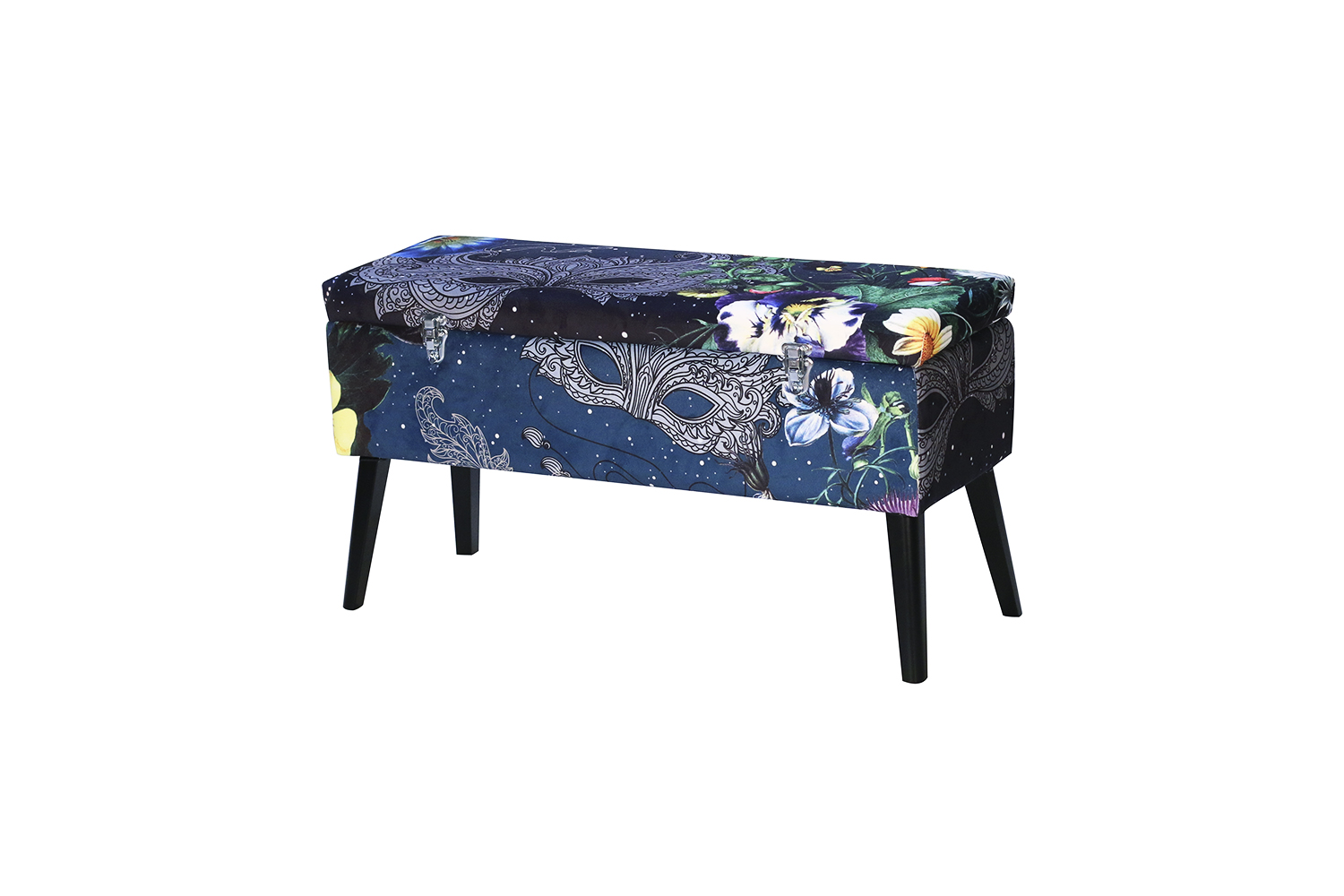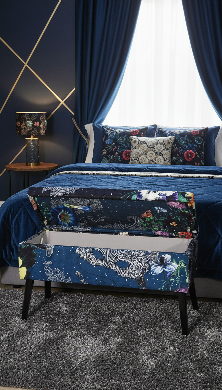 Arcón tipo maleta de diseño sofisticado y funcional, perfecto para aportar almacenaje y estilo a cualquier espacio. Su tapizado con estampado artístico de inspiración ornamental y floral sobre fondo oscuro crea una pieza decorativa de gran impacto visual, ideal para interiores modernos, eclécticos o con carácter.