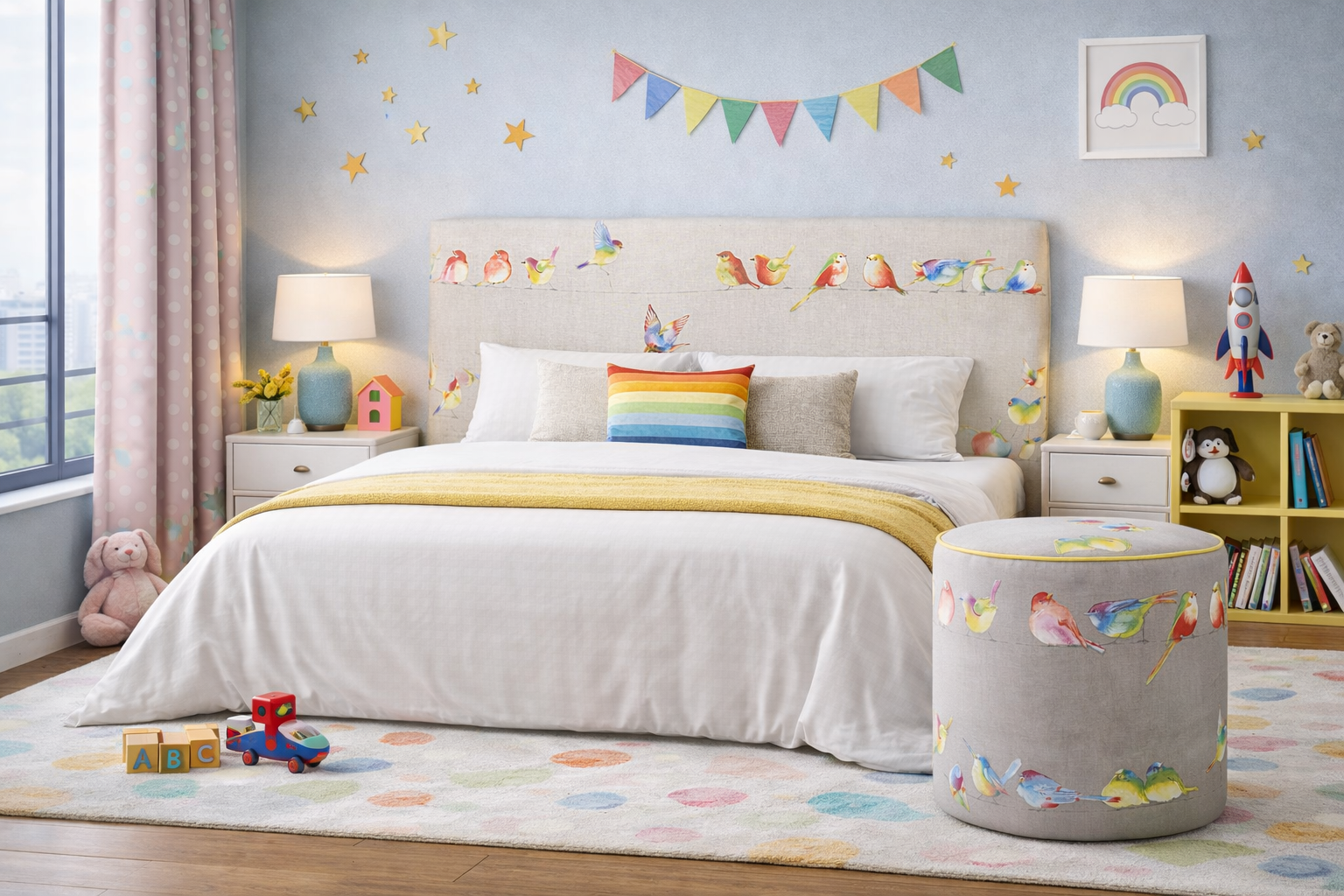 El diseño presenta un elegante motivo de aves ilustradas en estilo acuarela, que aporta ligereza, armonía y un aire natural al dormitorio. Su estética suave y sofisticada lo convierte en una opción ideal para ambientes contemporáneos, románticos o de inspiración natural, aportando un toque distintivo sin perder elegancia.