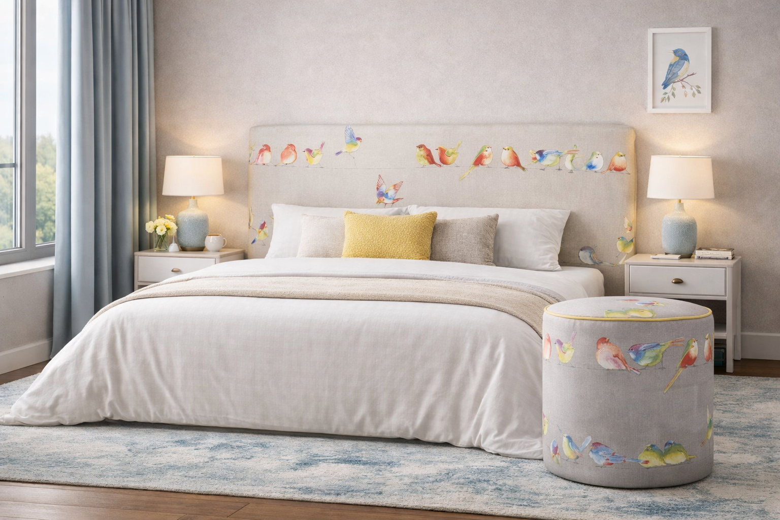 El diseño presenta un elegante motivo de aves ilustradas en estilo acuarela, que aporta ligereza, armonía y un aire natural al dormitorio. Su estética suave y sofisticada lo convierte en una opción ideal para ambientes contemporáneos, románticos o de inspiración natural, aportando un toque distintivo sin perder elegancia.