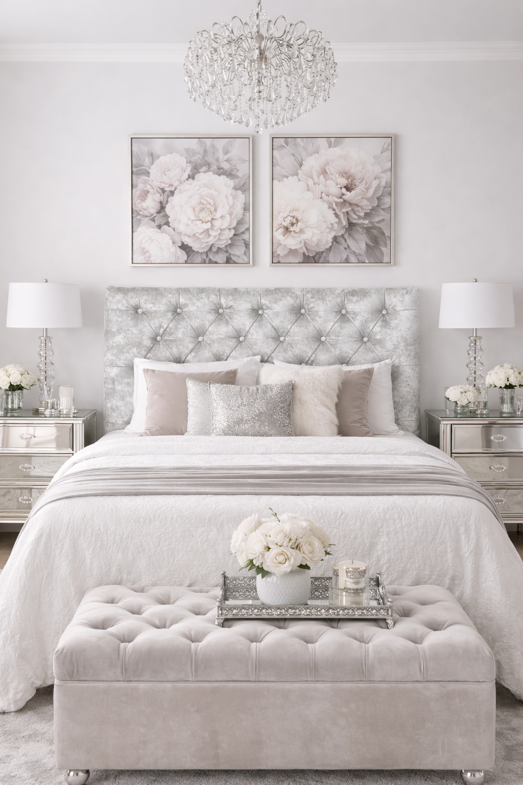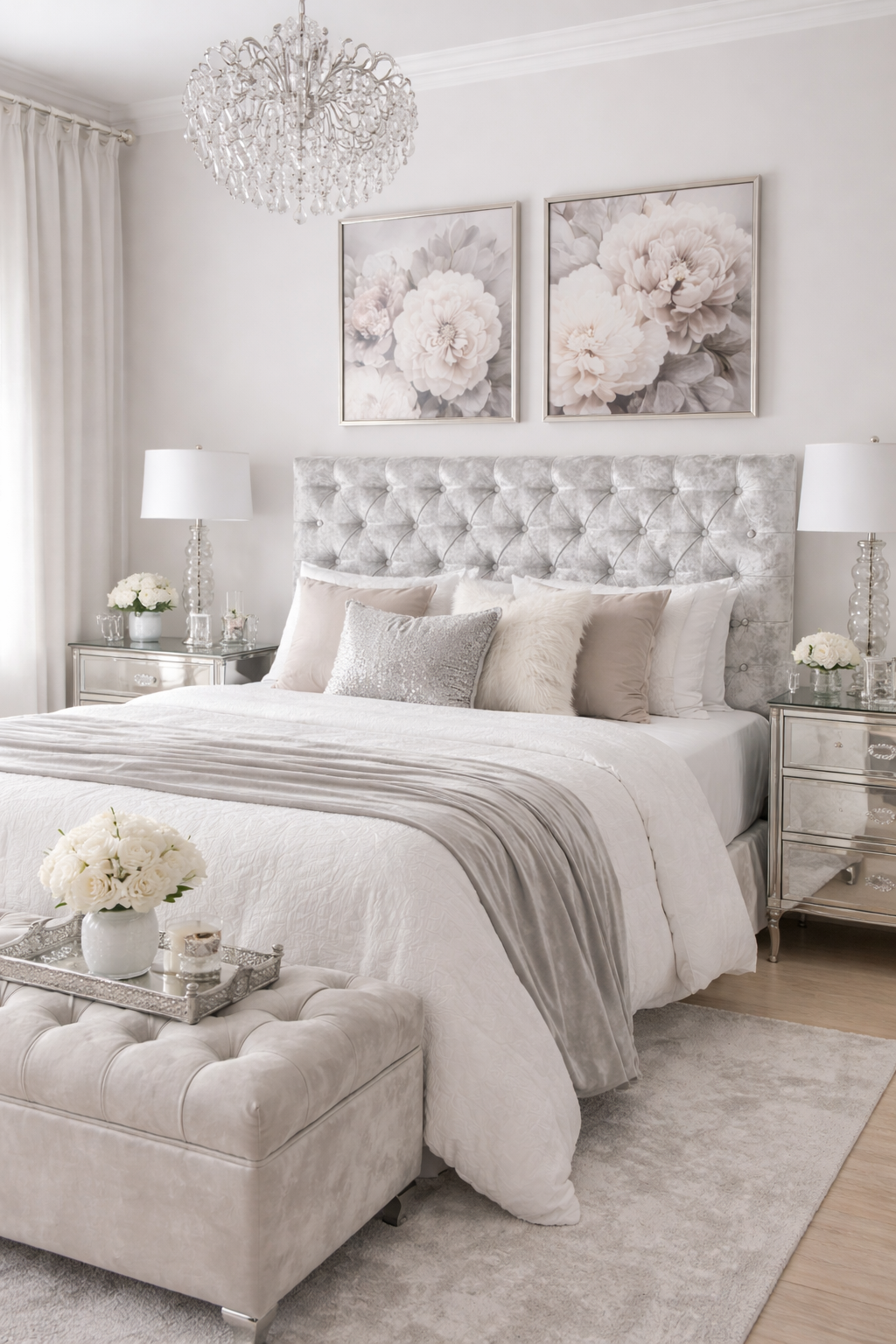 Cabecero Capitonné con Botones en Tejido Gris Plateado