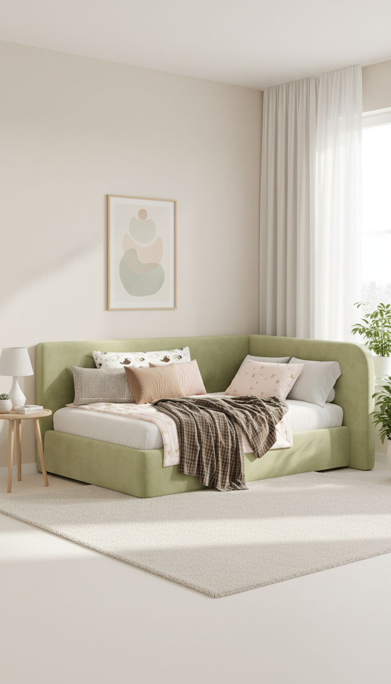 Cama infantil de diseño envolvente y líneas suaves, ideal para crear un espacio de descanso cómodo, seguro y con estilo. Su estructura tapizada en un delicado tono verde aporta calidez y un aire moderno que se adapta fácilmente a dormitorios infantiles y juveniles, creando un ambiente relajante y acogedor.