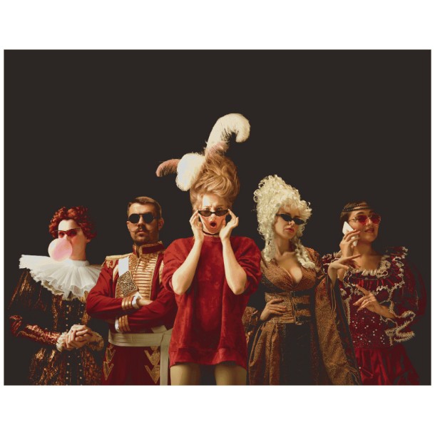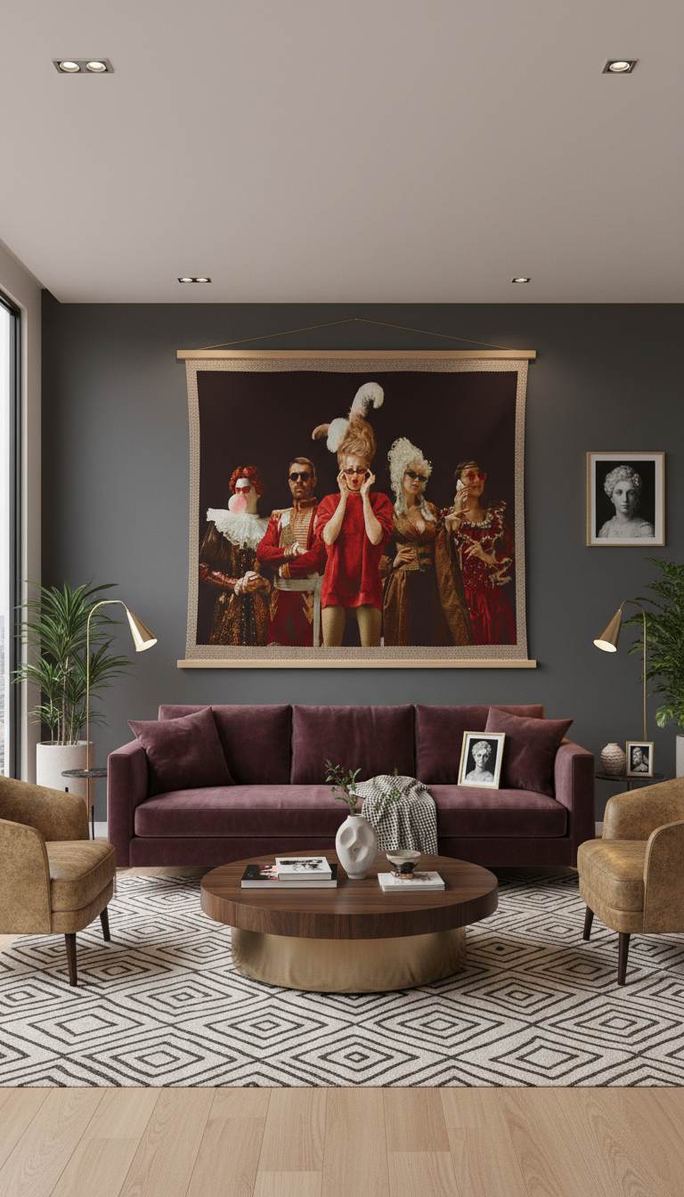 Original y provocador tapiz decorativo que fusiona estética clásica y actitud contemporánea. La imagen presenta un grupo de personajes vestidos con indumentaria de inspiración barroca y teatral, reinterpretada con un enfoque moderno, desenfadado y casi irreverente. Las expresiones, accesorios y gestos aportan dinamismo y un marcado carácter artístico que rompe con lo convencional.
