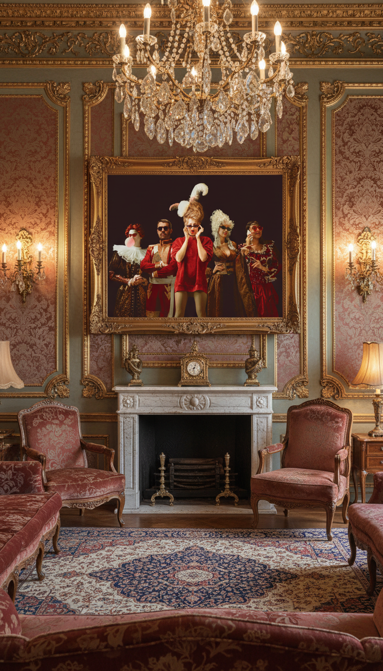 El contraste entre los trajes de época, los colores intensos —rojos, dorados y negros— y los elementos actuales crea una escena visualmente impactante, ideal para espacios que buscan diferenciarse y transmitir creatividad, humor y sofisticación.