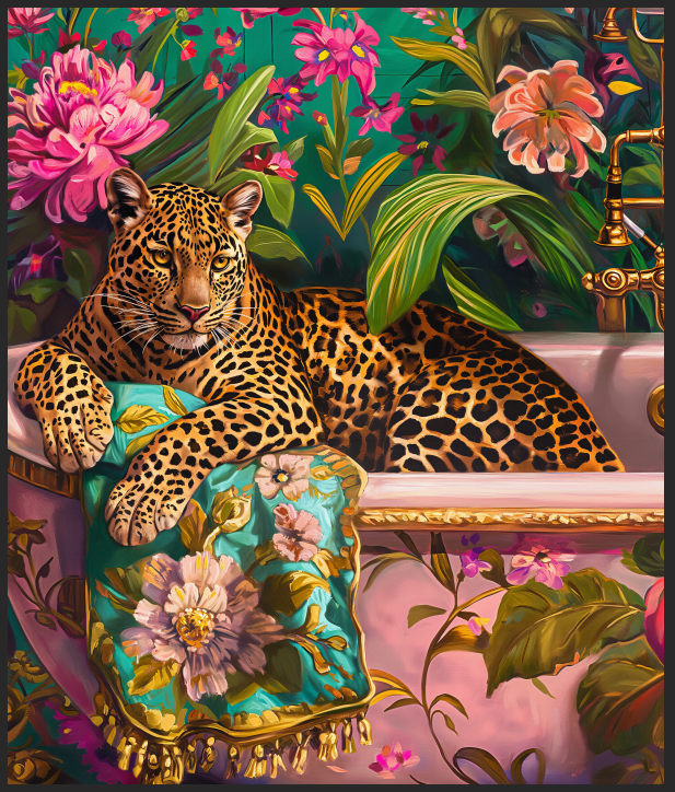 El contraste entre lo salvaje y lo refinado da vida a una pieza única, perfecta para quienes buscan arte con carácter. Cada detalle —desde las hojas tropicales hasta el brillo del pelaje— fue diseñado para transmitir armonía, sofisticación y un toque de fantasía.