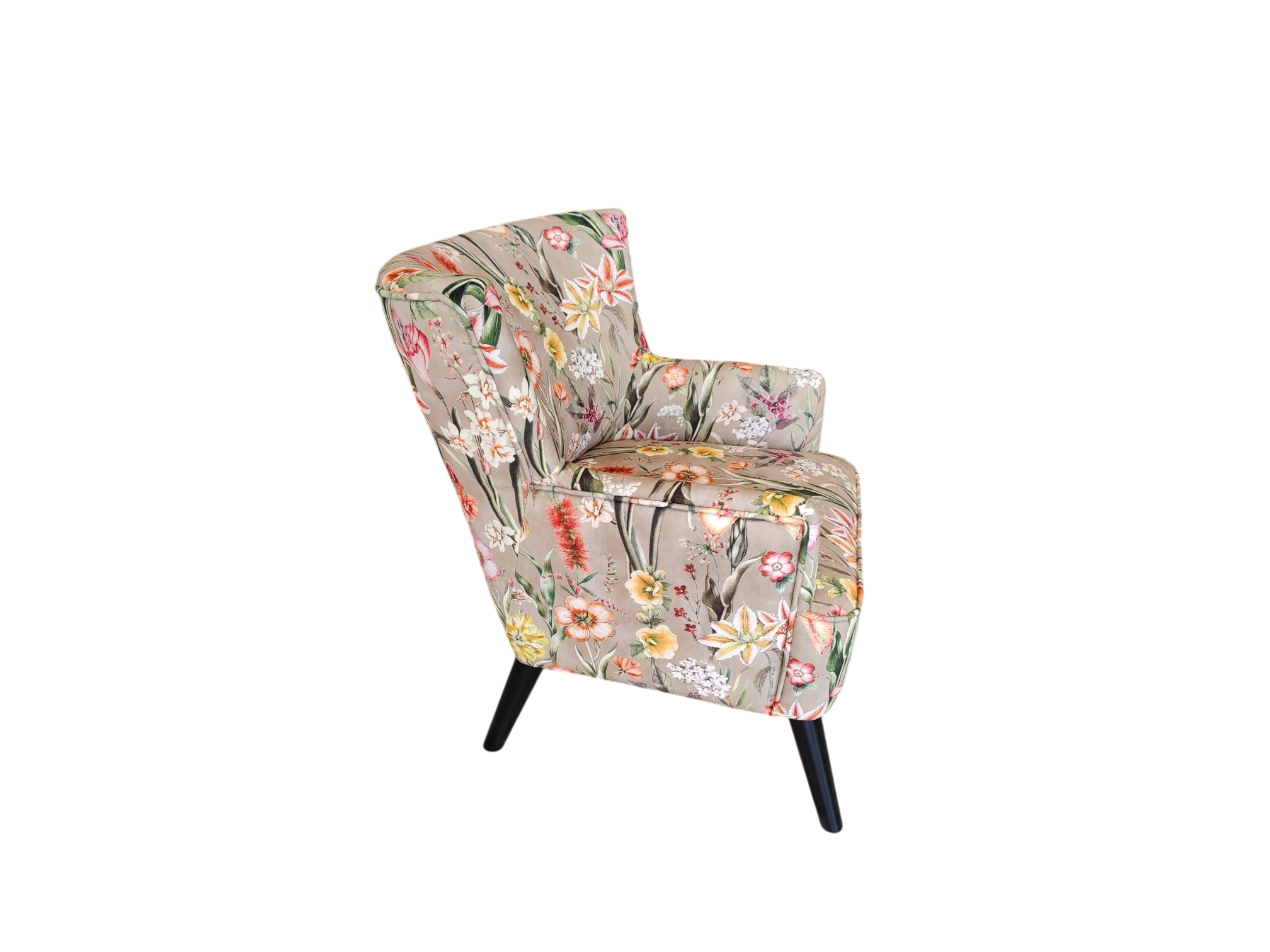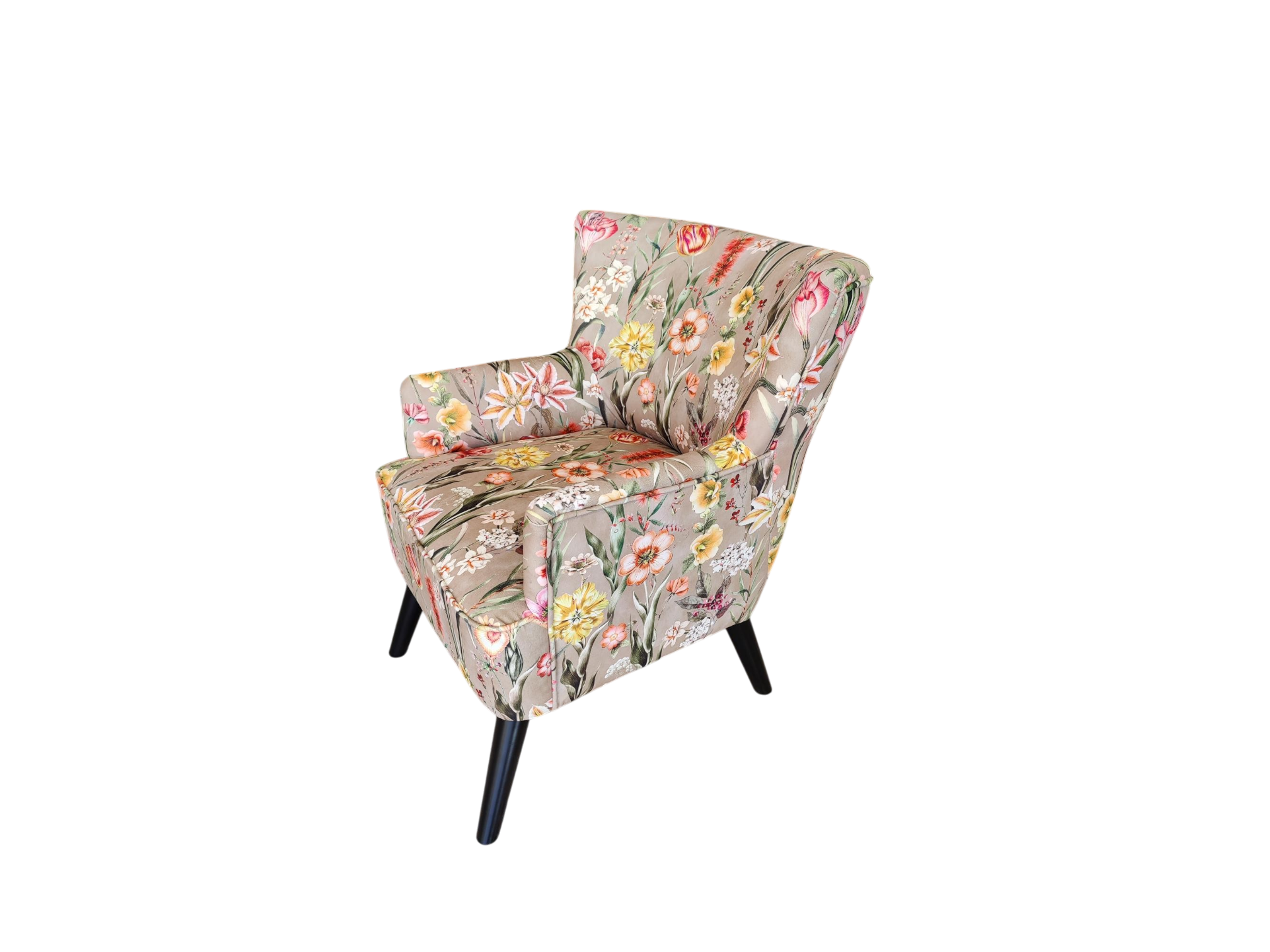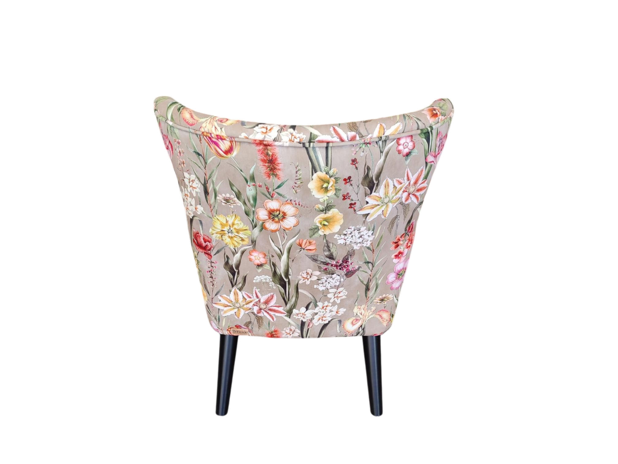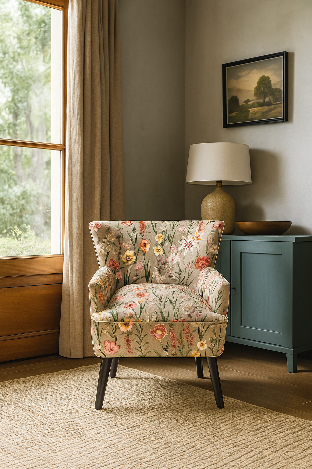 Sillón de diseño delicado y atemporal que combina comodidad y estilo con una estética cálida y natural. Su tapizado con motivo floral de inspiración botánica aporta frescura y un aire romántico, ideal para crear ambientes acogedores y llenos de personalidad.