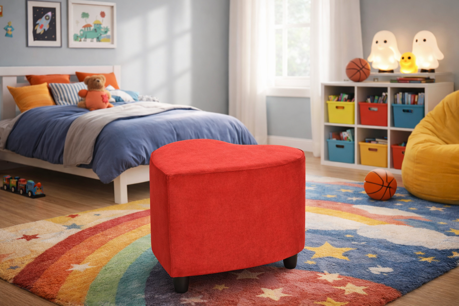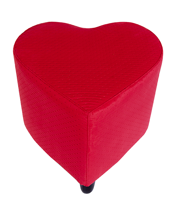 Pouf decorativo de diseño original con forma de corazón, perfecto para aportar un toque divertido, elegante y lleno de personalidad a cualquier espacio. Su tapizado en tono rojo intenso le da protagonismo visual, convirtiéndolo en una pieza ideal como asiento auxiliar o elemento decorativo.