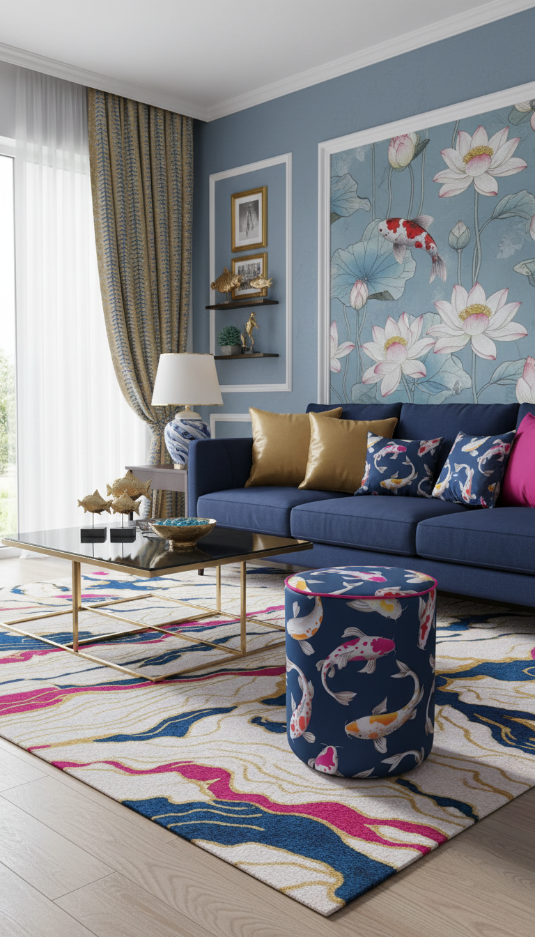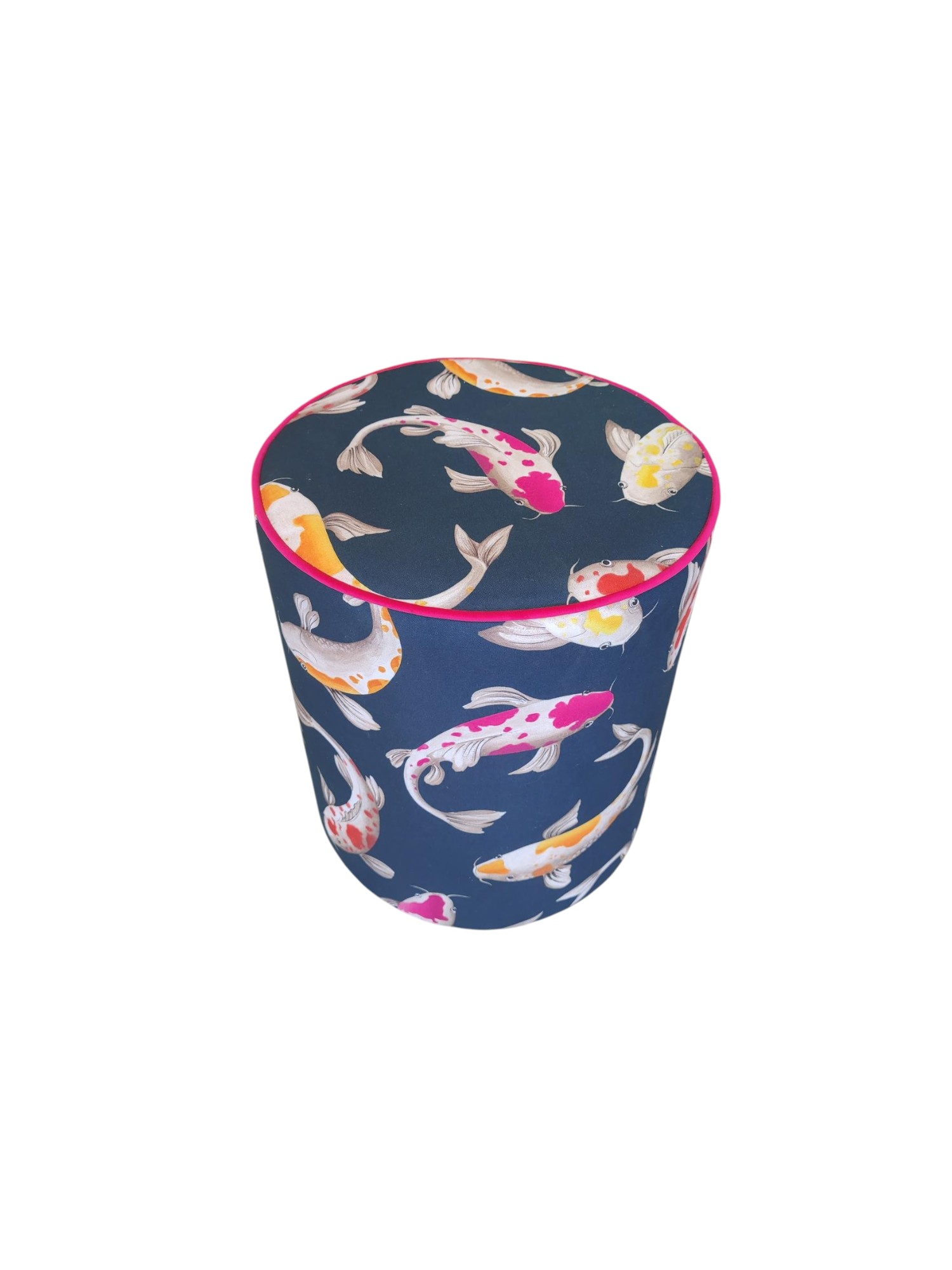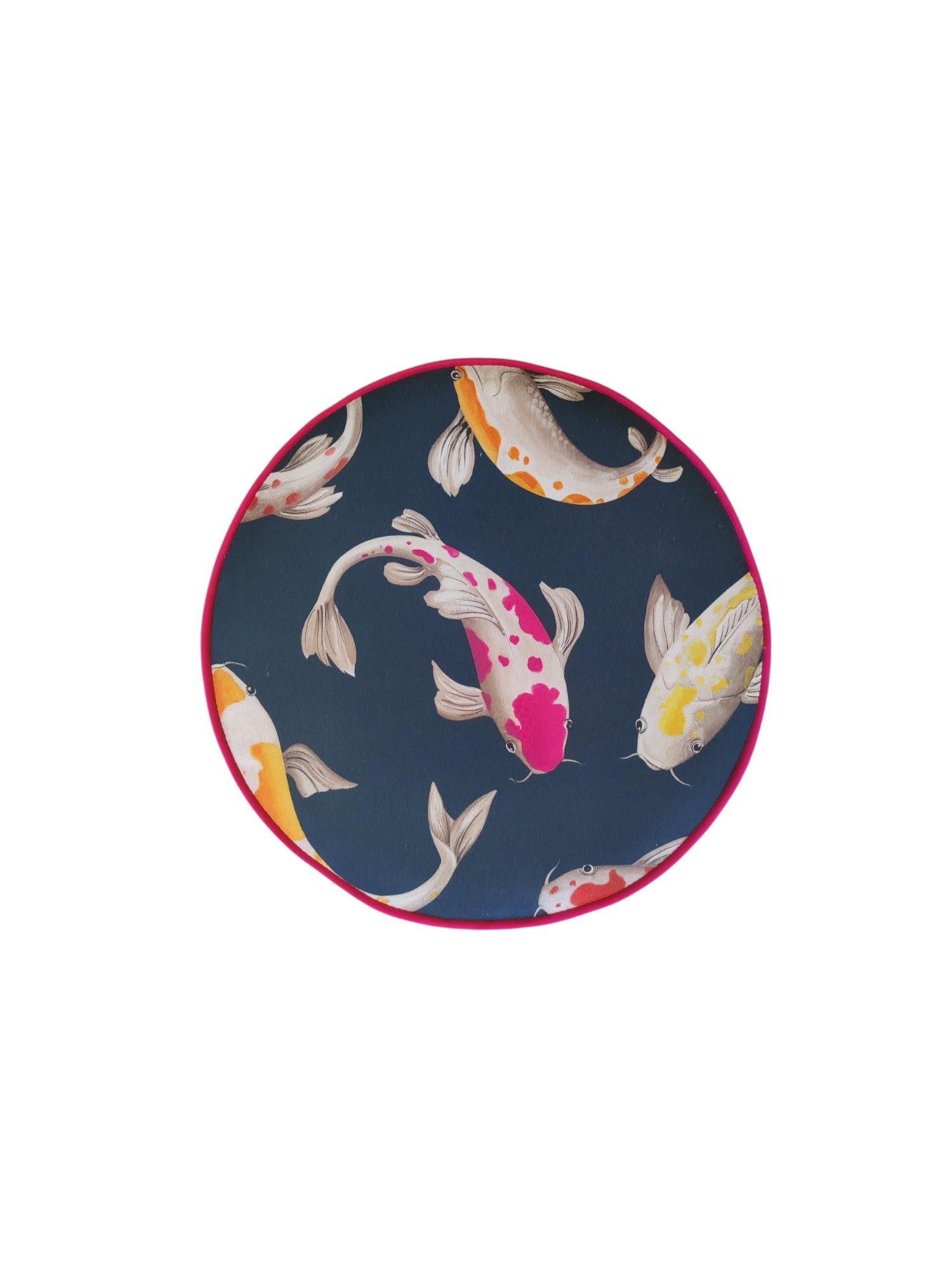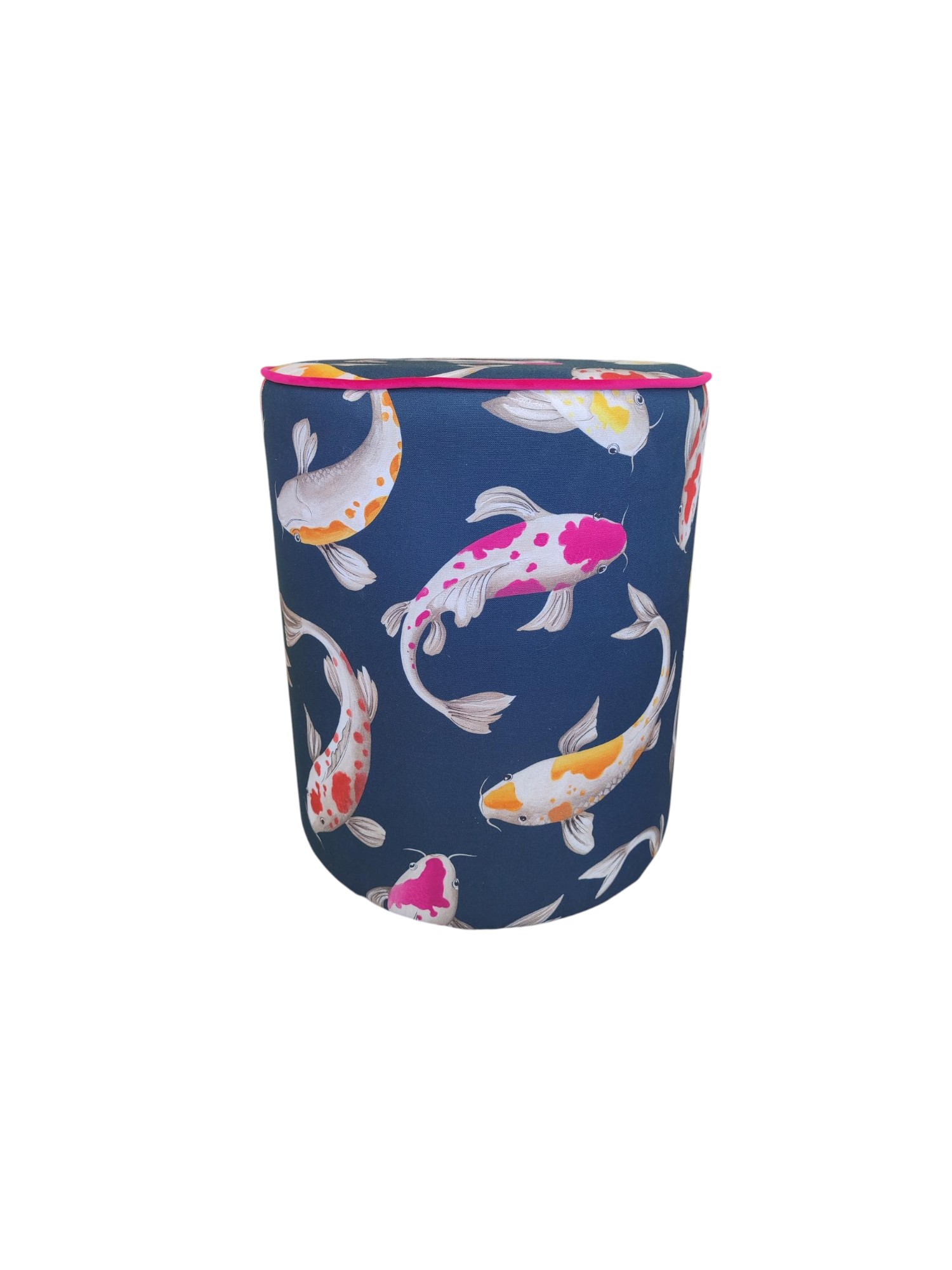 Pouf de diseño original y contemporáneo, perfecto para aportar un toque artístico y colorido a cualquier espacio. Su tapizado presenta un estampado de peces koi sobre fondo azul, creando una composición dinámica y elegante que evoca calma y movimiento, ideal para interiores con personalidad.