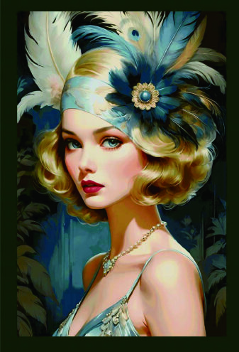 Impresionante tapiz de pared de gran formato que aporta elegancia, sofisticación y un aire artístico atemporal a cualquier espacio. La imagen muestra un delicado retrato femenino de inspiración Art Déco, con rasgos suaves y mirada expresiva, rodeada de plumas en tonos azulados, verdes y dorados que crean una composición envolvente y llena de profundidad.