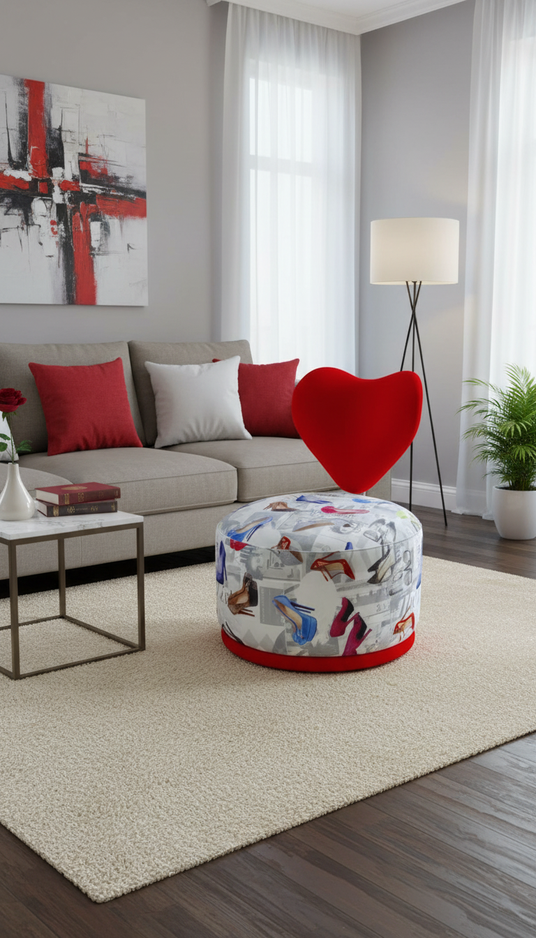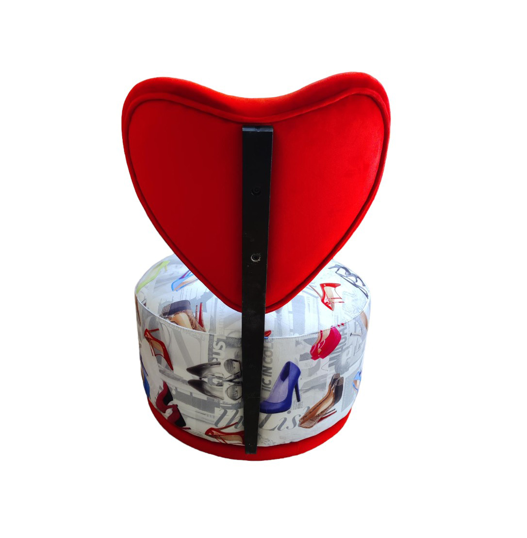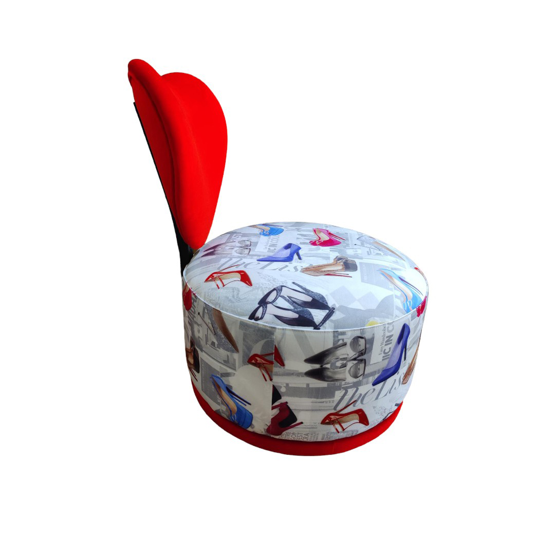 Sillón giratorio de diseño atrevido y femenino, ideal para aportar un toque divertido y sofisticado a cualquier espacio. Su respaldo tapizado en terciopelo rojo en forma envolvente aporta elegancia y confort, mientras que el asiento con tejido de diseño de zapatos de tacón añade un punto creativo y moderno que lo convierte en una pieza única y muy decorativa.