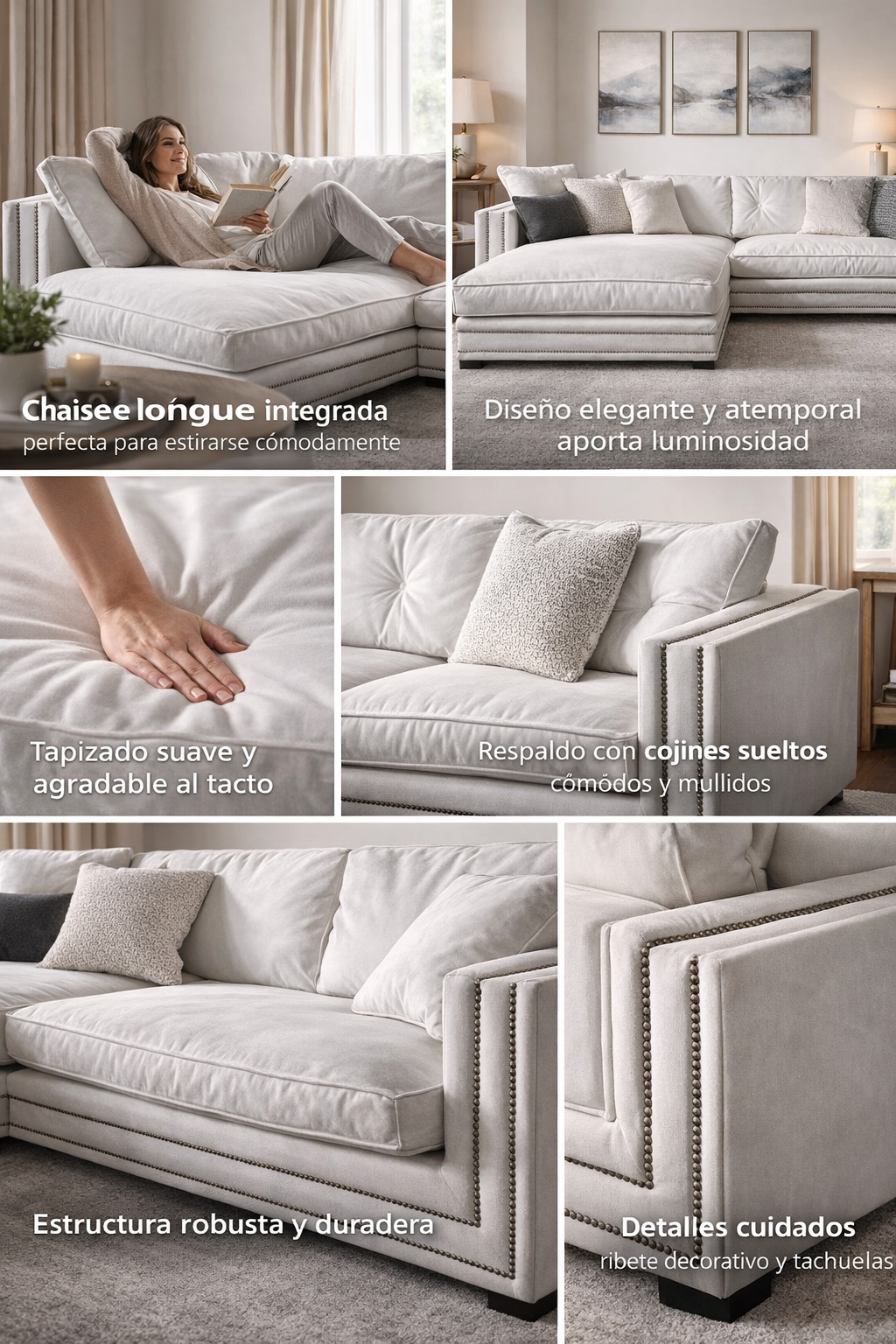 Cuenta con una chaise longue integrada, perfecta para disfrutar de momentos de descanso y relax. Los cojines de respaldo mullidos y los asientos amplios proporcionan una sentada cómoda y envolvente, ideal tanto para el uso diario como para reuniones familiares o sociales.