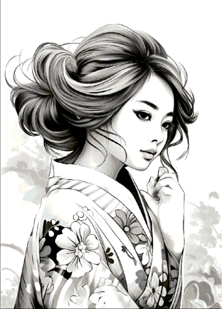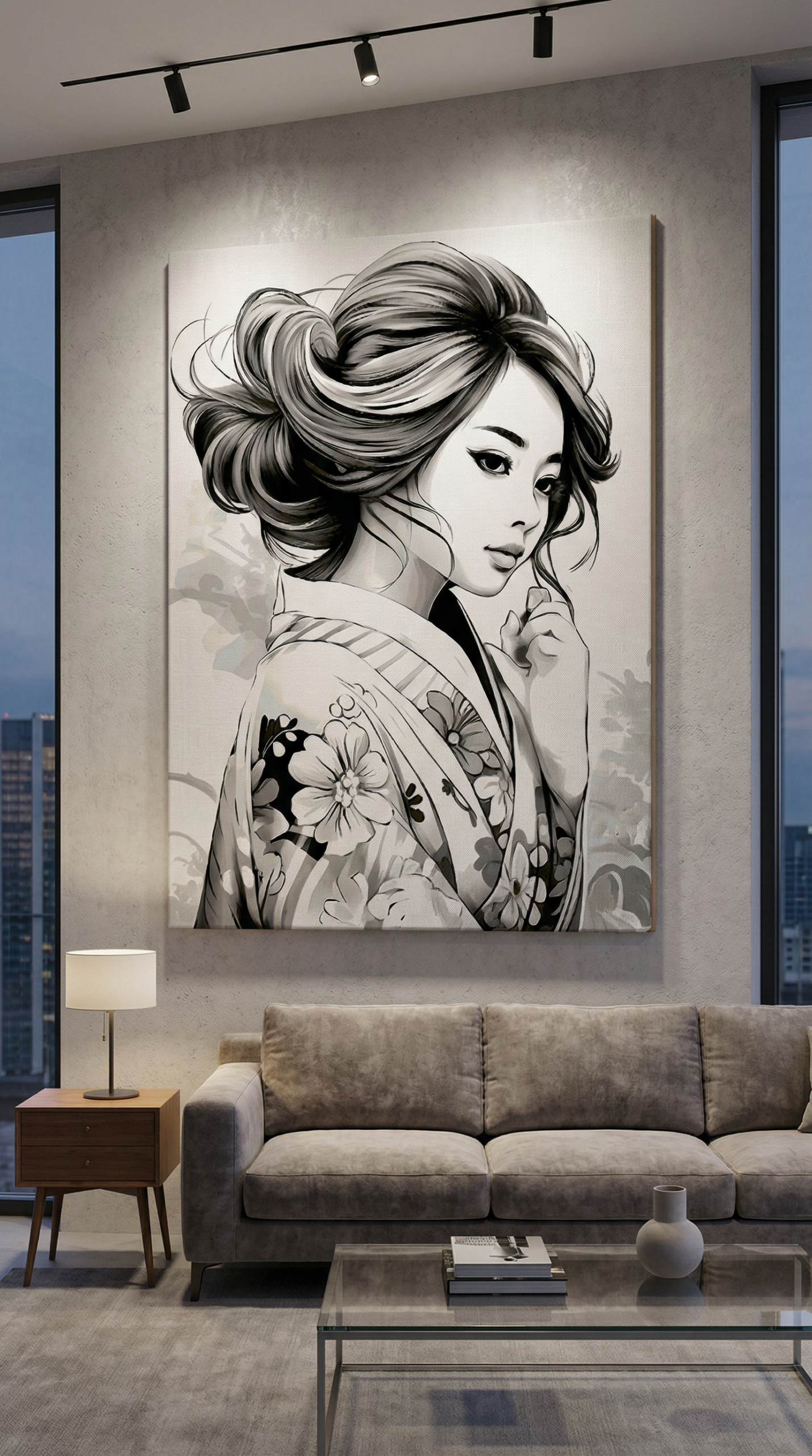 Este sofisticado tapiz de pared destaca por su delicado diseño de inspiración oriental, protagonizado por la figura de una elegante mujer con rasgos suaves y vestimenta tradicional, en una composición artística llena de armonía y sensibilidad.