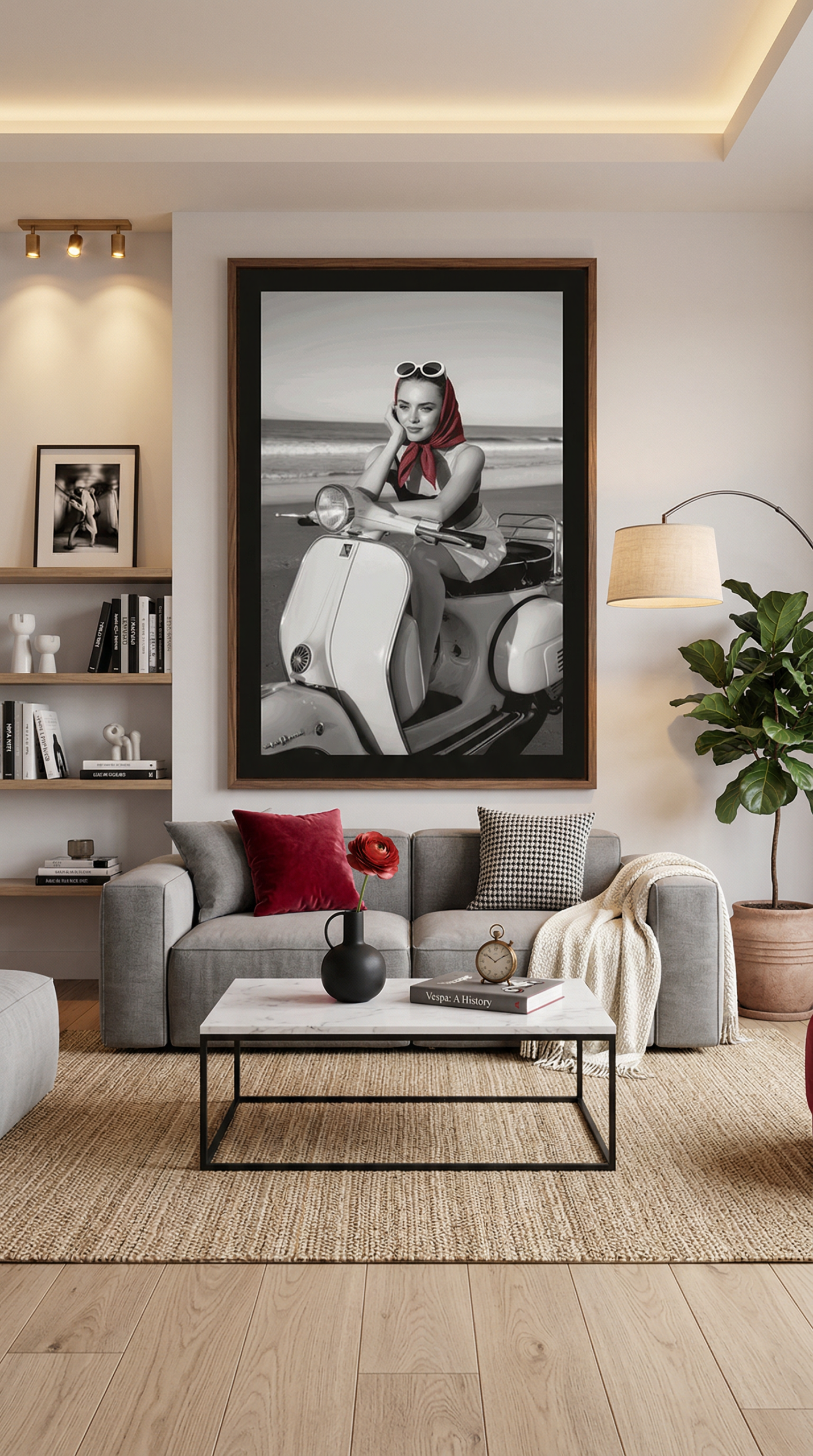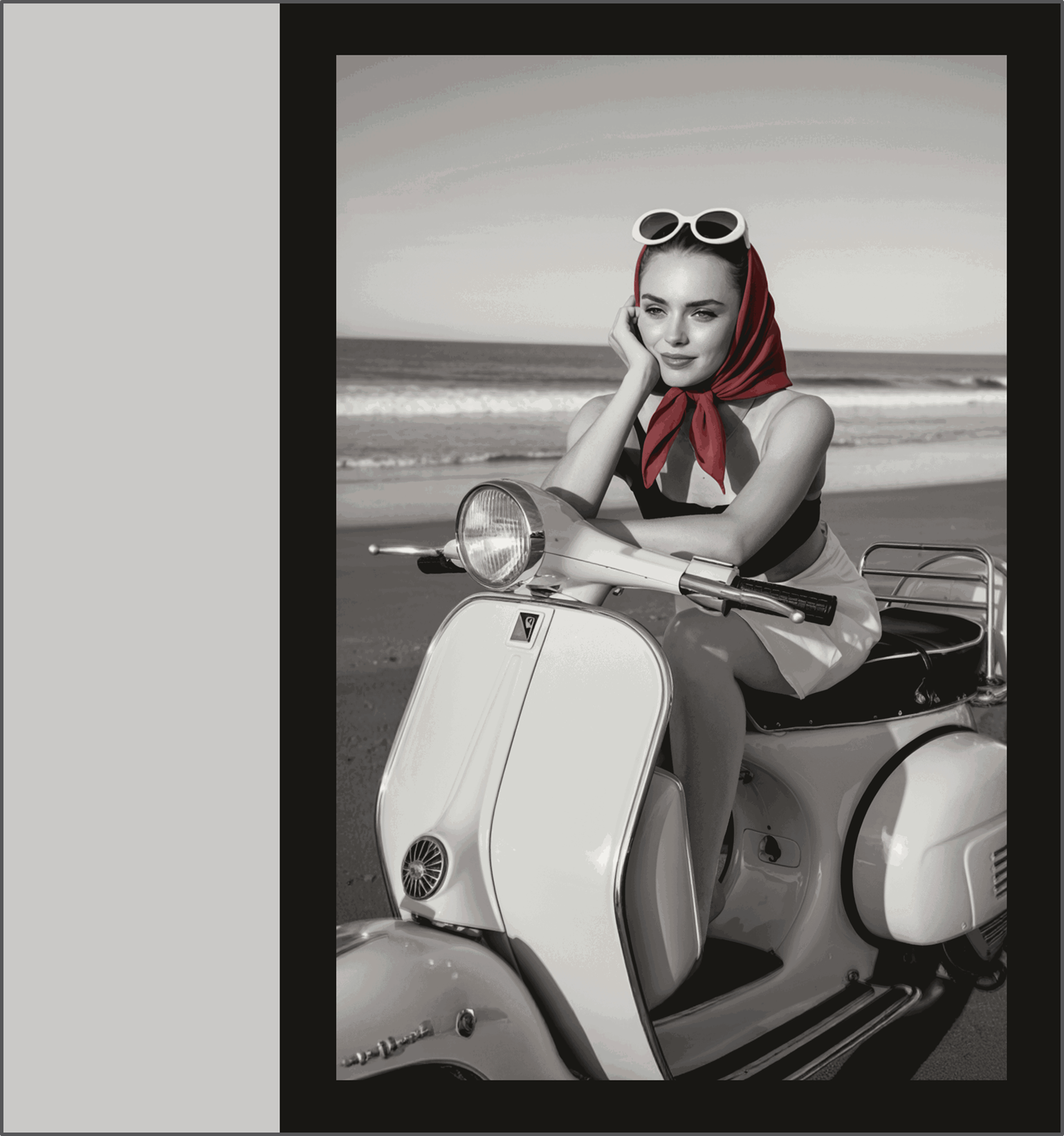 La escena, protagonizada por una mujer sobre una scooter en la playa, evoca libertad, verano y un estilo de vida desenfadado pero refinado. Su estética cuidada y cinematográfica lo convierte en una pieza decorativa ideal para quienes buscan añadir carácter y personalidad a su hogar.