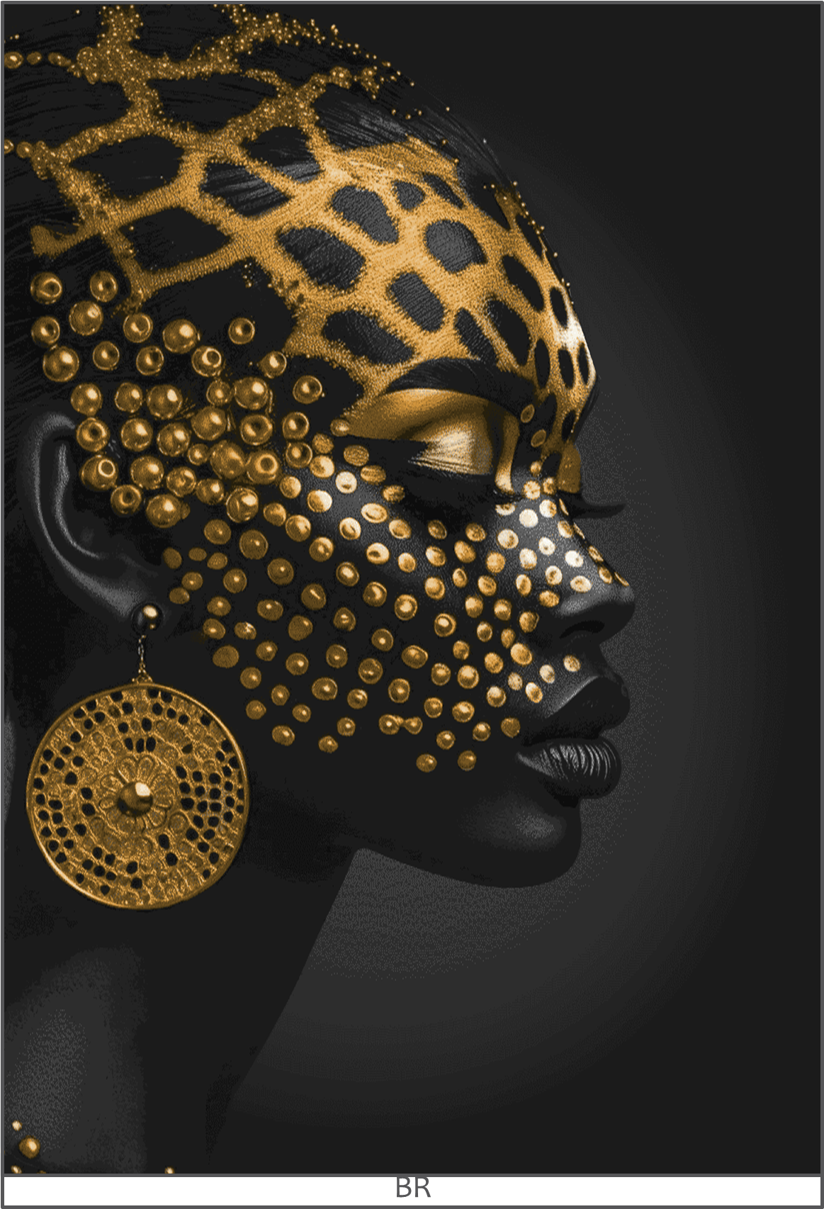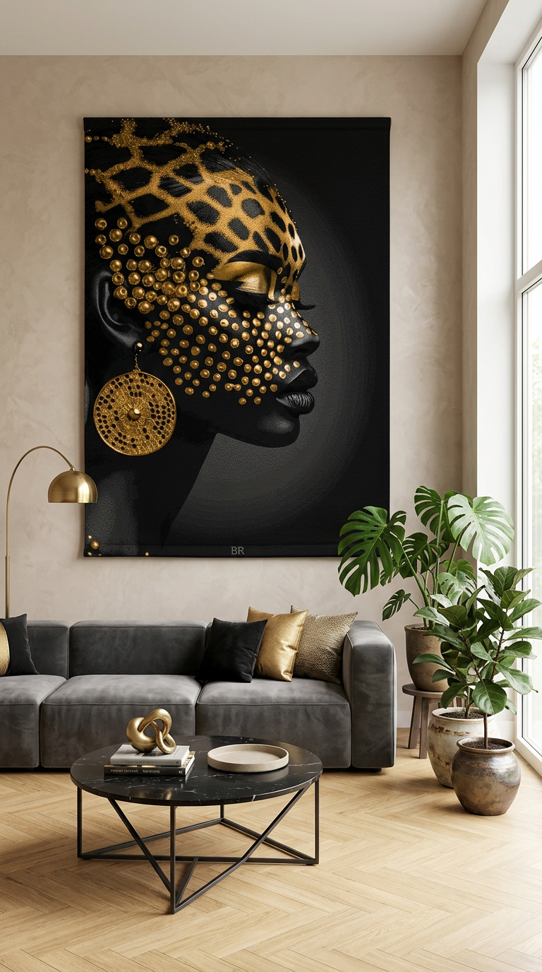 Este impactante tapiz de pared destaca por su potente estética artística y sofisticada, donde la figura femenina se convierte en protagonista a través de un diseño lleno de fuerza, belleza y detalle. Los contrastes entre el negro profundo y los acabados en tonos dorados crean una pieza única, ideal para ambientes modernos y con carácter.