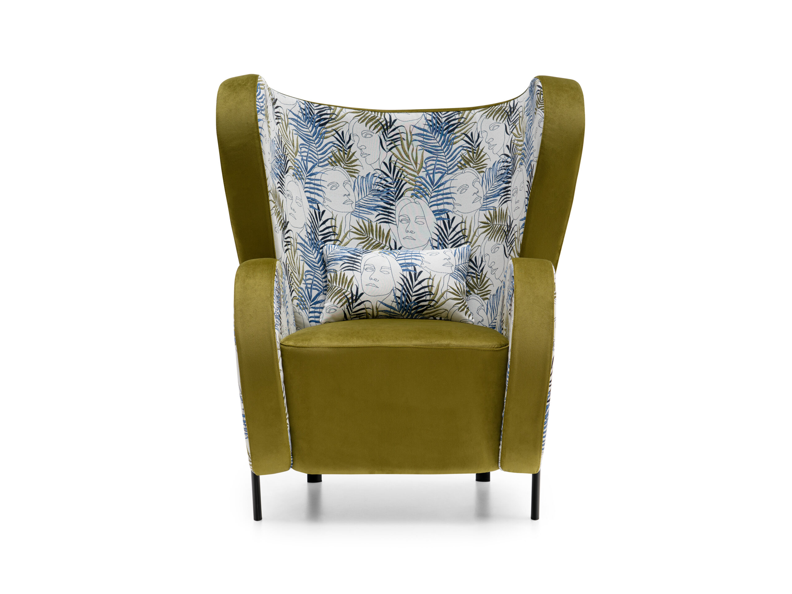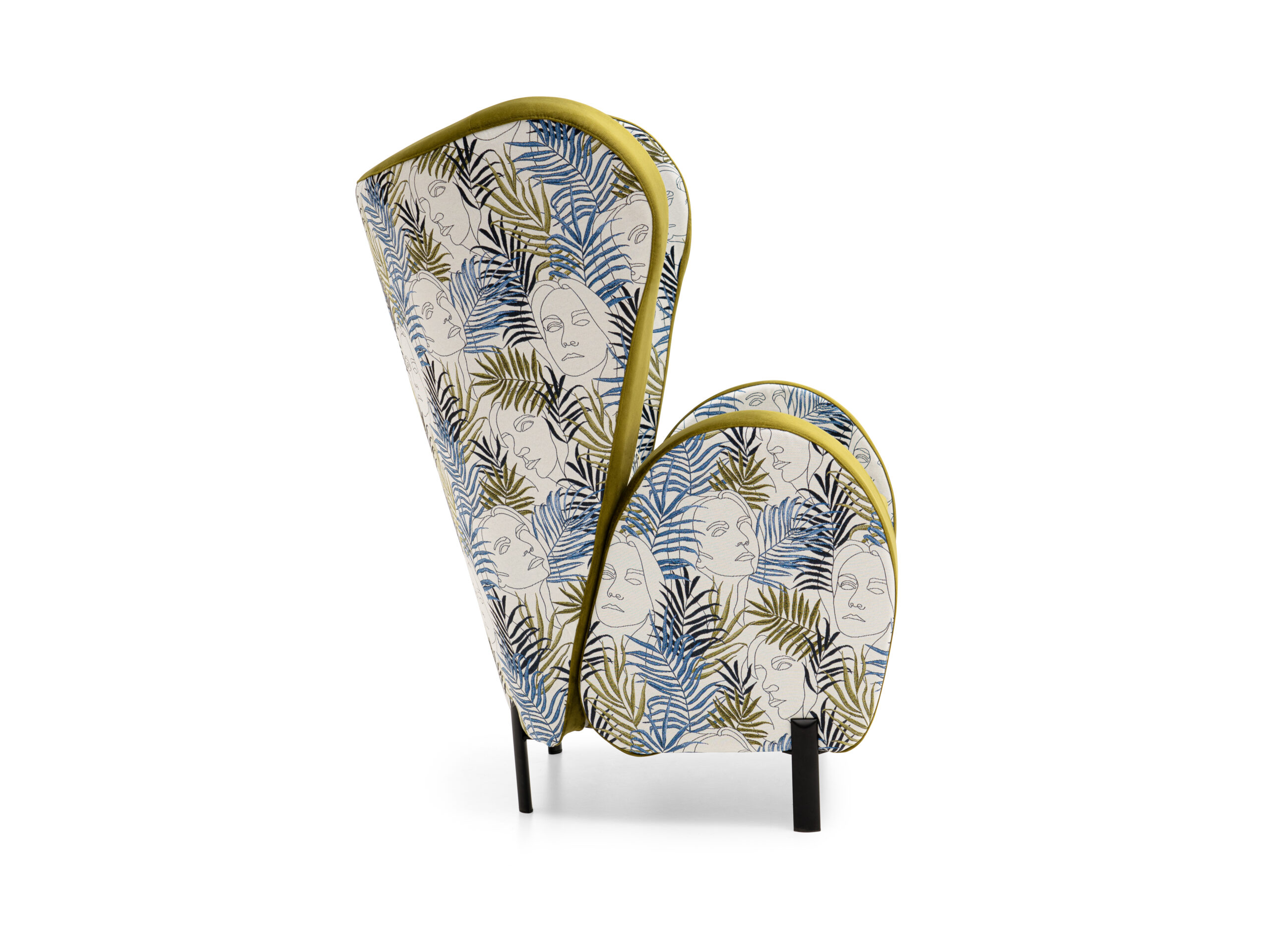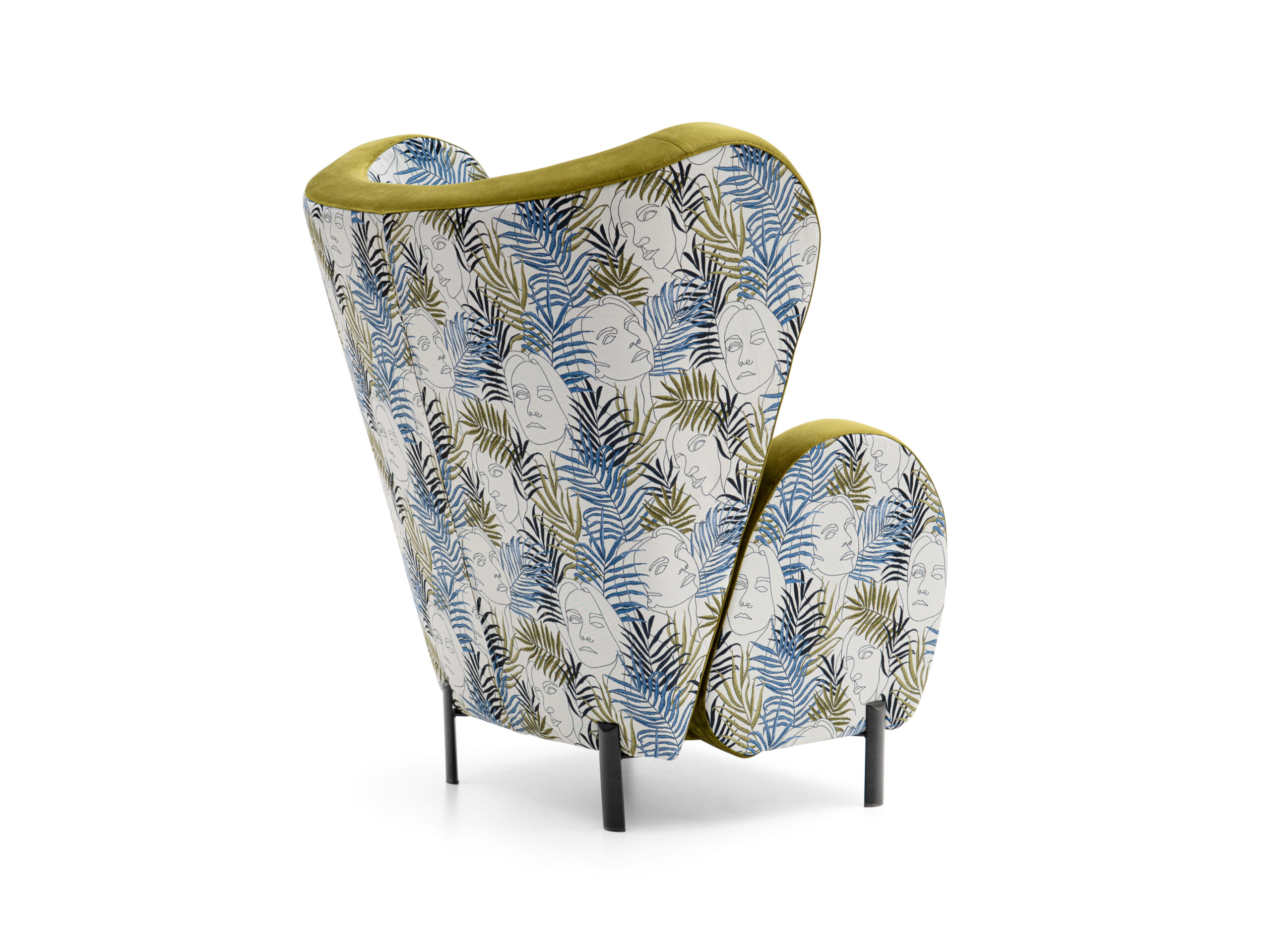 El tapizado mezcla de forma armoniosa un tejido liso en tono verde oliva con un estampado artístico de inspiración vegetal y rostros lineales, creando un contraste moderno y sofisticado que aporta carácter y originalidad al conjunto. Los pies metálicos en color negro aportan ligereza visual y un acabado contemporáneo que equilibra el diseño.