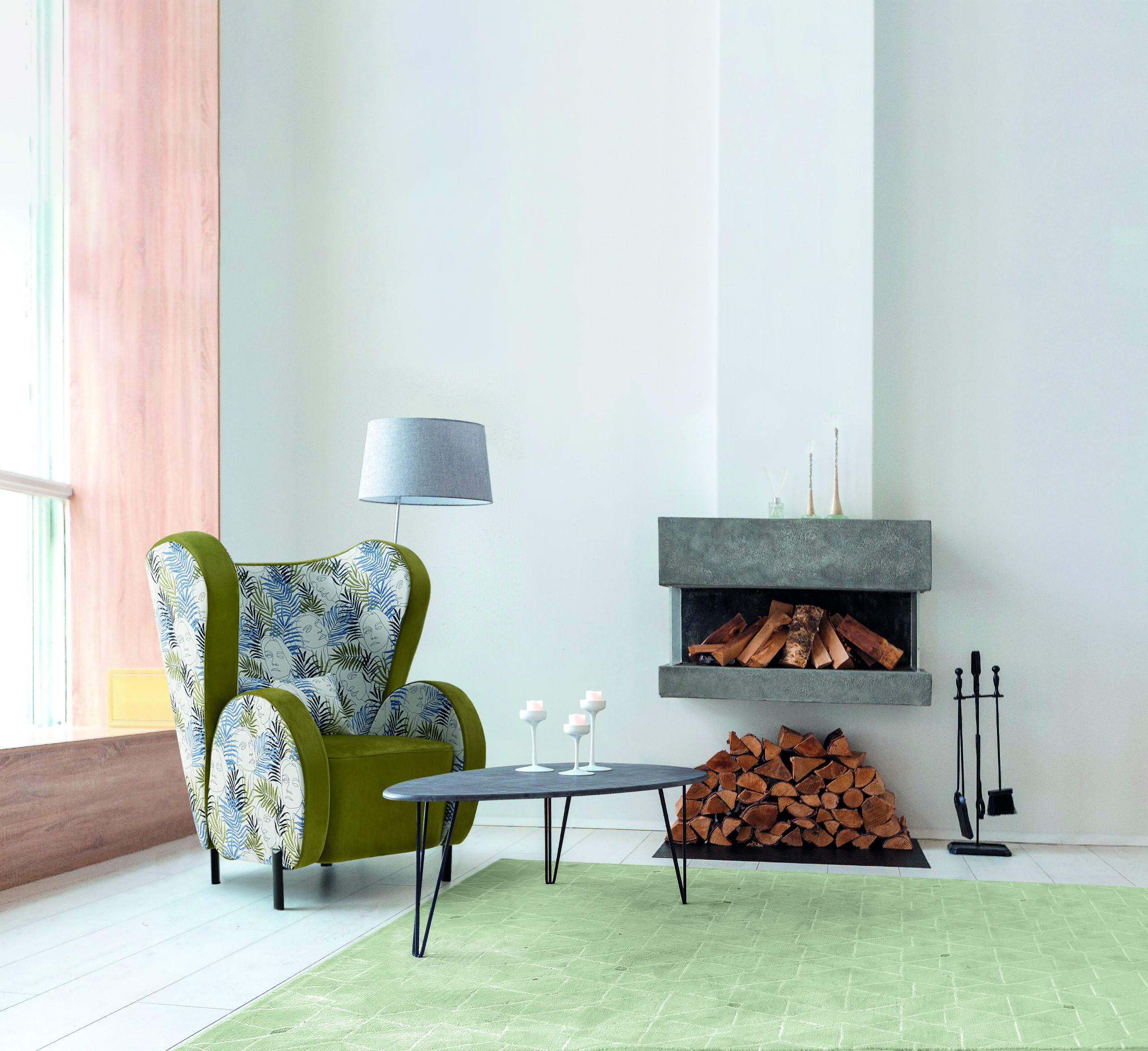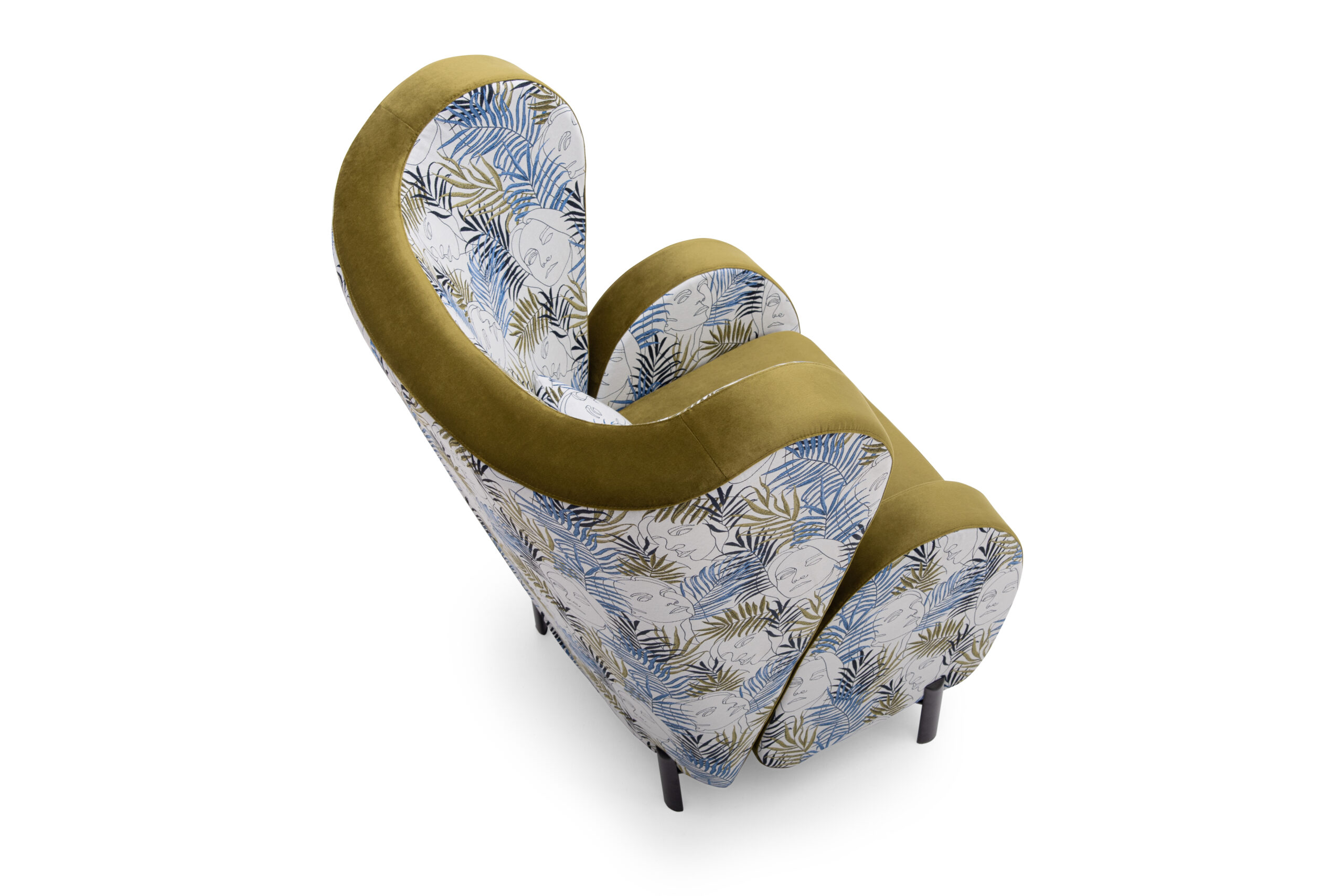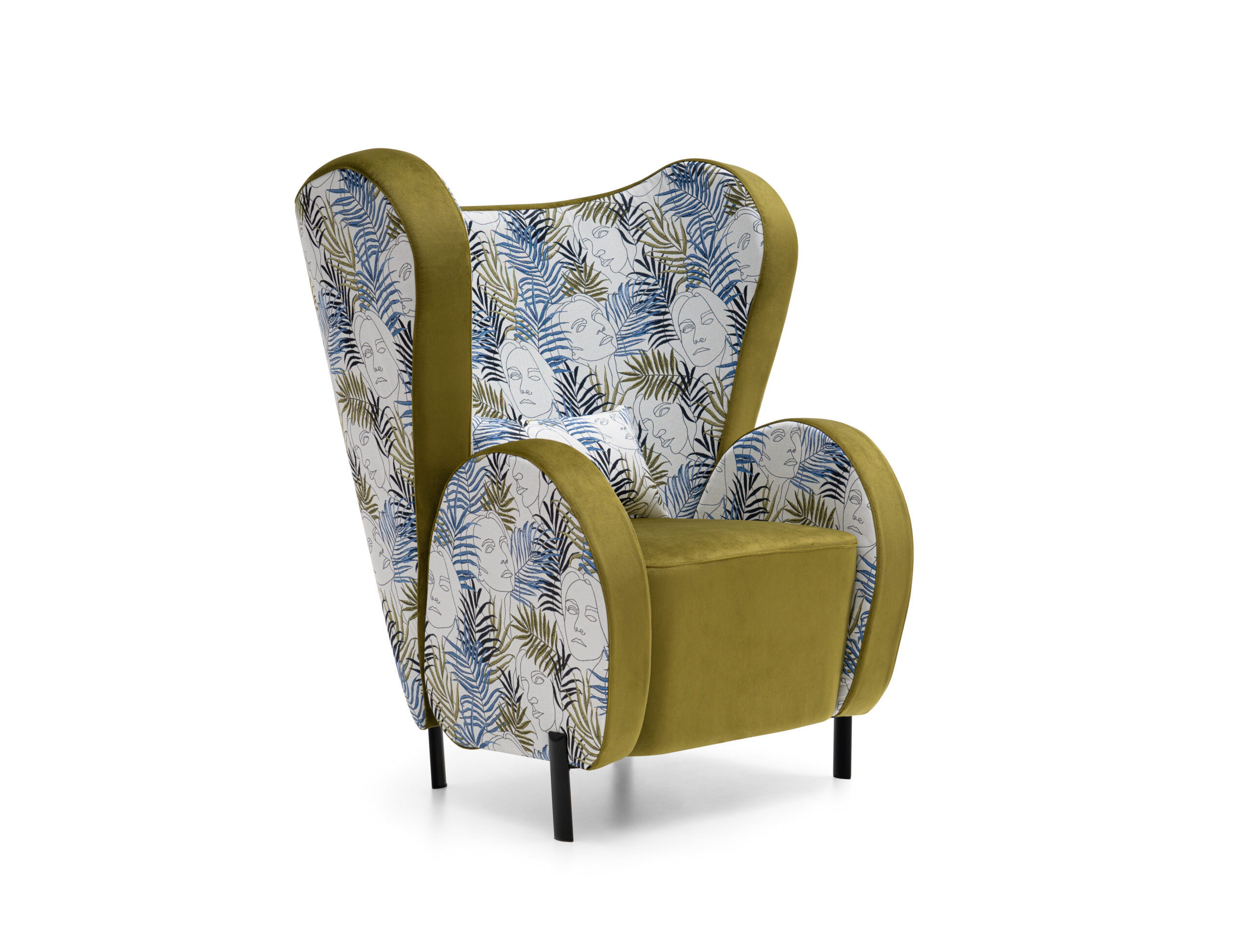El tapizado mezcla de forma armoniosa un tejido liso en tono verde oliva con un estampado artístico de inspiración vegetal y rostros lineales, creando un contraste moderno y sofisticado que aporta carácter y originalidad al conjunto. Los pies metálicos en color negro aportan ligereza visual y un acabado contemporáneo que equilibra el diseño.